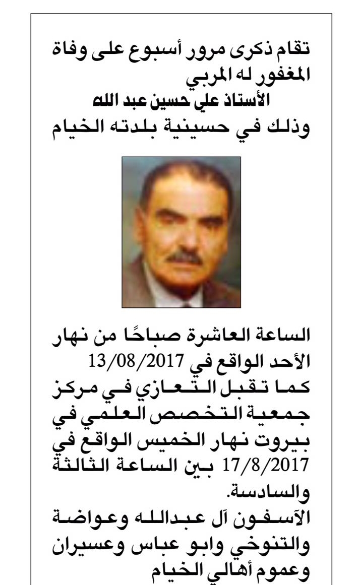 تقام الذكرى عند الساعة العاشرة من صباح يوم الأحد الموافق (٢٠١٧/٠٨/١٣) للرجال والنساء في حسينية بلدتهما الخيام.
