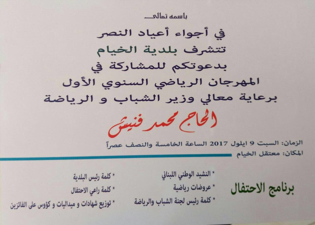 في أجواء أعياد النصر، تتشرف بلدية الخيام بدعوتكم للمشاركة في المهرجان الرياضي السنوي الاول برعاية معالي وزير الشباب والرياضة الحاج محمد فنيش.