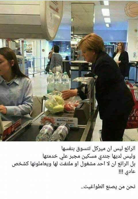 ٣- مستشارة ألمانيا " ميركل " تتسوق من السوبرماركت بدون حراسة او مواكبة ومن الناس الموجودين لا يعيروها اهتماماً .