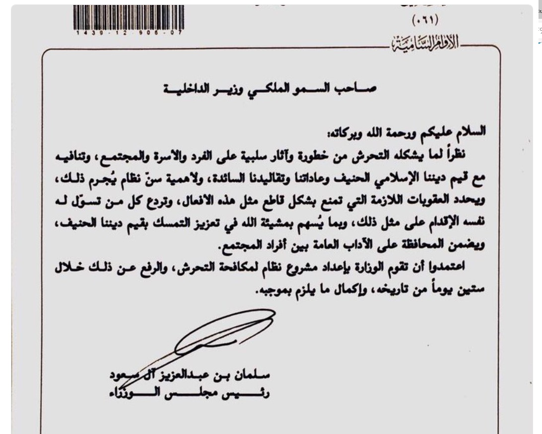 وتداول نشطاء صورة للأمر الملكي الذي جاء فيه: "صاحب السمو الملكي وزير الداخلية، نظرا لما يشكله التحرش من خطورة وآثار سلبية على الفرد والأسرة والمجتمع وتنافيه مع قيم ديننا الإسلامي الحنيف وعاداتنا وتقاليدنا السائدة.. ولأهمية سن نظام يجرم ذلك ويحدد العقوبات اللازمة التي تمنع بشكل قاطع مثل هذه الأفعال وتردع كل من تسول له نفسه الإقدام على مثل ذلك".. "وبما يسهم بمشيئة الله في تعزيز التمسك بقيم ديننا الحنيف ويضمن المحافظة على الآداب العامة بين أفراد المجتمع، اعتمدوا أن تقوم الوزارة بإعداد مشروع نظام لمكافحة التحرش والرفع عن ذلك خلال ستين يوما وإكمال ما يلزم بموجبه".