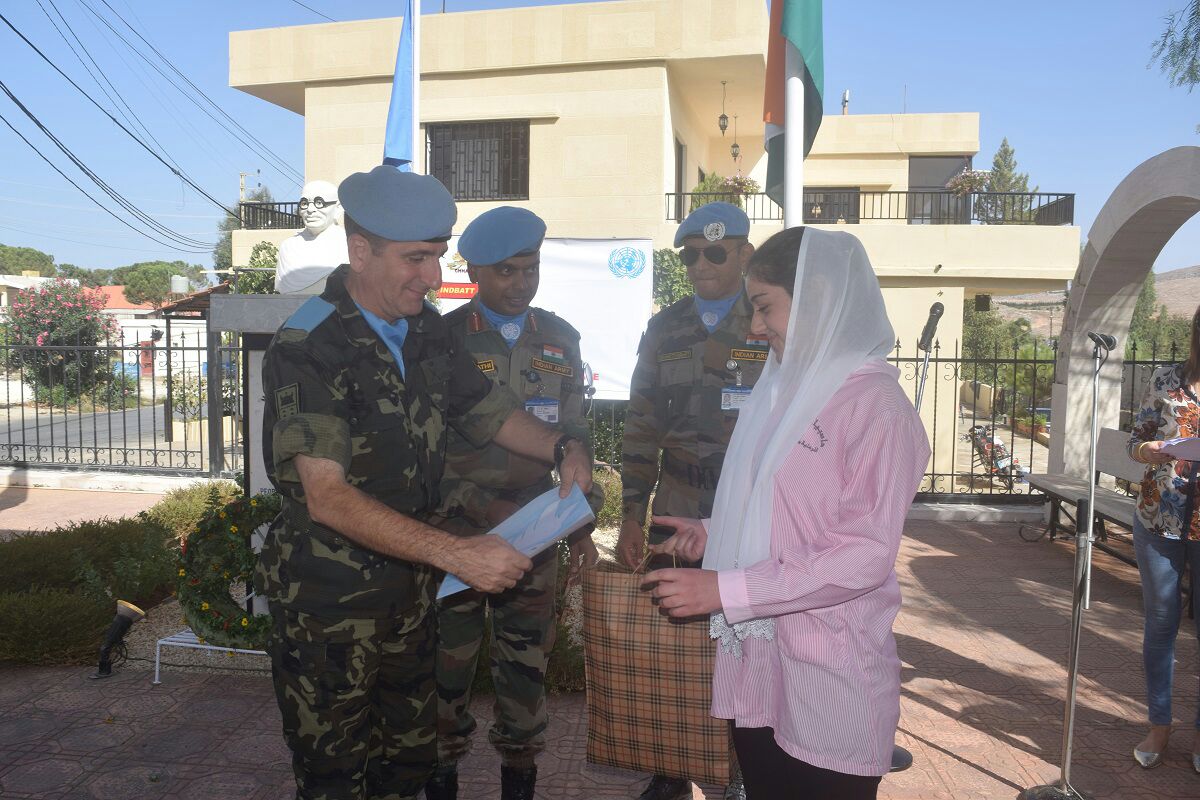 بدأ الاحتفال بوضع أكاليل من الزهر على النصب التذكاري للمهاتما غاندي من قبل جميع الضيوف كما هو متعارف. تلا ذلك القاء كلمات من قبل شخصيات مختلفة تحدثوا عن حياة المهاتما والدروس التي تعلموها منه. بعدها قام قائد القطاع الشرقي العميد فينانسيو أغوادو دي دييغو بتوزيع جوائز على الأطفال الذين فازوا في مسابقة الرسم التي نظمتها الكتيبة في مدرسة سوق الخان للأطفال ذوي الاحتياجات الخاصة بمساعدة المديرة السيدة لينا أبو كرنيب.
