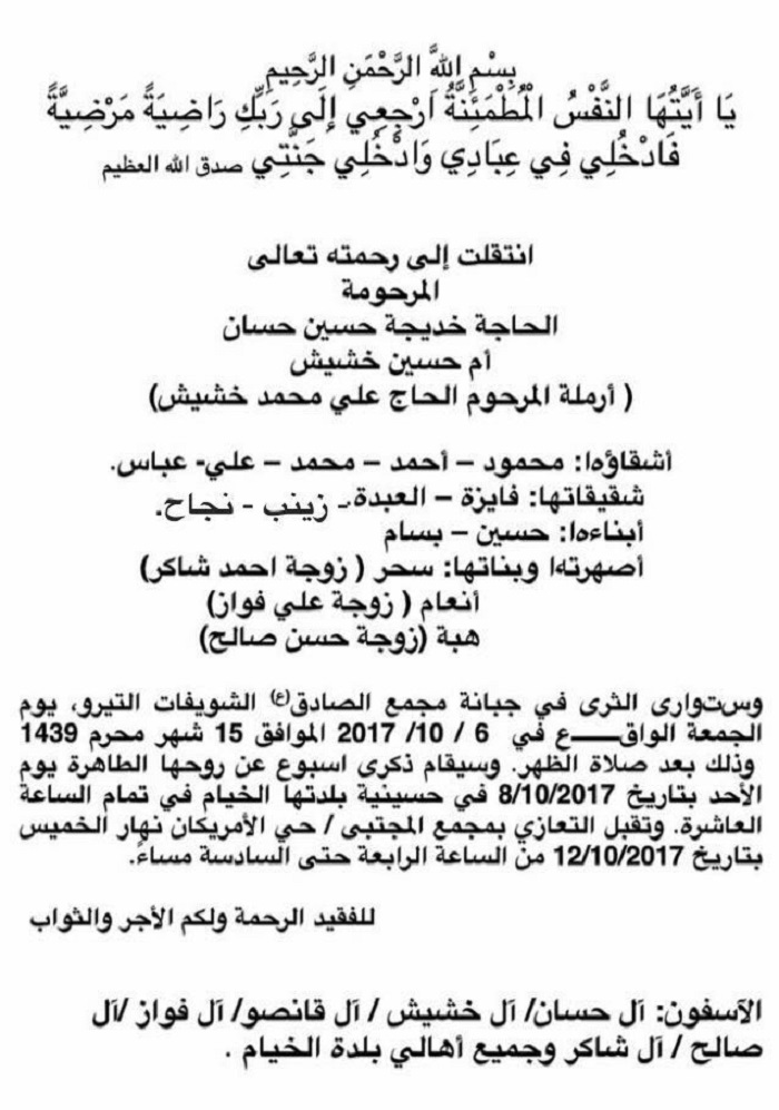 سجل التعازي بالمرحومة خديجة حسين حسان (أم حسين خشيش)