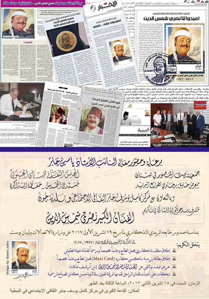 ينطلق من عاصمة جبل عامل، مدينة النبطية تكريم آخر للفنان نصري شمس الدين يتمثل بإقامة حفل متنوع يتخلله، إطلاق جمعية بيت المصور في لبنان ومعرض خليل برجاوي لطوابع البريد مغلف تذكاري وبطاقة بريدية (ماكسي كاردMaxi Card ) كذلك من تصميم كامل جابر ورسم (المغلف) الفنانة خولة الطفيلي، ويحملان الطابع البريدي مع ختم خاص، فضلاً عن عرض فيلم وثائقي وتقديم رقصات ودبكات على أغنيات نصري.... بالتعاون مع المجلس الثقافي للبنان الجنوبي ومركز كامل يوسف جابر الثقافي الاجتماعي وبلدية جون ومنتدى حفظة الذاكرة... بتاريخ 18 تشرين الثاني 2017، في مركز كامل جابر في مدينة النبطية...