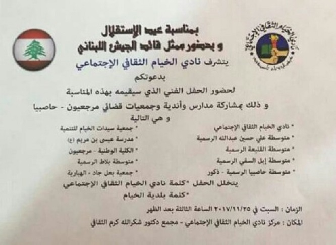 يمناسبة عيد الإستقلال، وبحضور ممثل قائد الجيش اللبناني، يقيم نادي الخيام الثقافي الإجتماعي حفلاً فنياً بمشاركة عدد من مدارس وأندية وجمعيات قضائي مرجعيون -وحاصبيا.