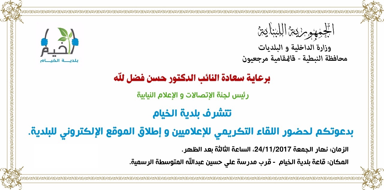برعاية النائب حسن فضل الله، تطلق بلدية الخيام موقعها الألكتروني عبر احتفال تقيمه عند الثالثة بعد ظهر نهار الجمعة 24 ت2 2017 الجاري في قاعة البلدية الكائنة قرب مدرسة الأستاذ علي عبدالله المتوسطة الرسمية.