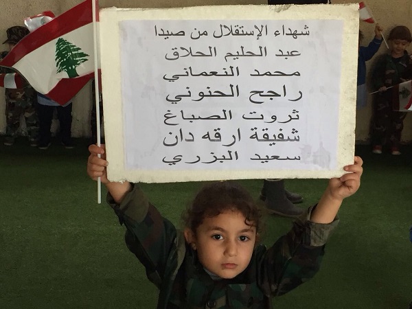 - وضع أكاليل من الزهور على أضرحة رجال الاستقلال في صيدا : الشهيد معروف سعد والرئيس عادل عسيران ، حيث قام وفد من قيادة المفوضية ضم القادة فاديا خريش، ثناء الظريف ، زهيرة الراعي العقاد والدكتور خالد الكردي بوضع الأكاليل وتلاوة الفاتحة على أرواح شهداء الوطن.