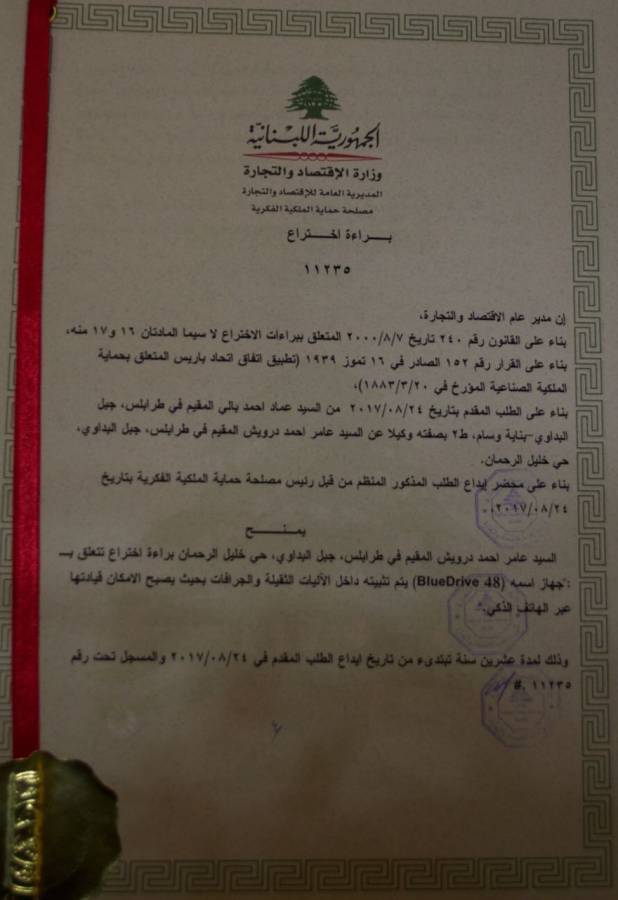 حصل الشاب الفلسطيني عامر درويش مواليد 1988 على براءة اختراع لجهاز أطلقت عليه تسمية BlueDrive 48، وبحسب براءة الاختراع التي نالها اختراعه من وزارة الاقتصاد والتجارة اللبنانية، فالجهاز يثبت داخل الآليات الثقيلة مما يسمح بقيادتها والتحكم بكافة أنظمتها عبر الهاتف الذكي بسهولة كبيرة وكأنها لعبة على الهاتف الذكي.