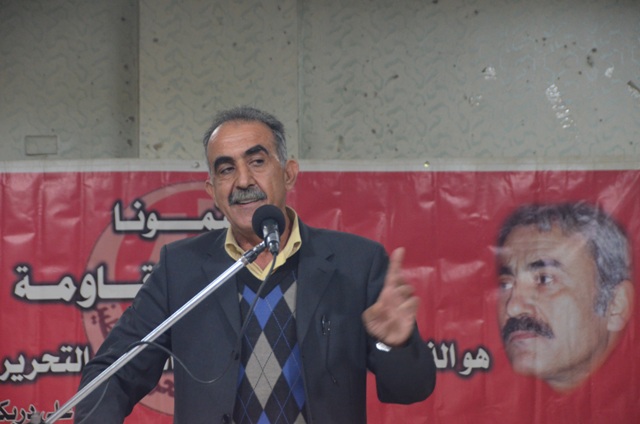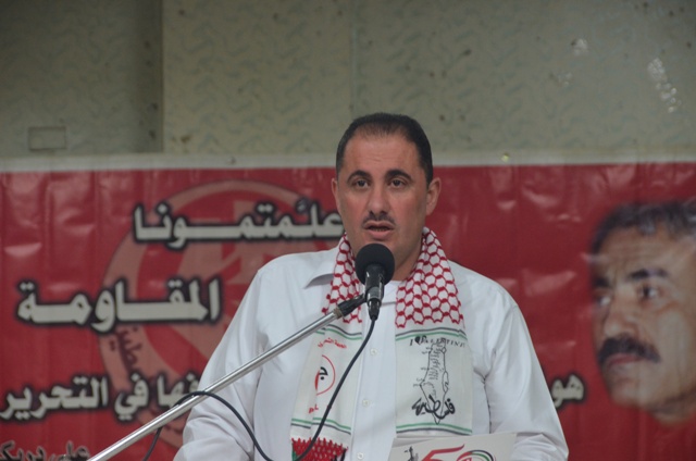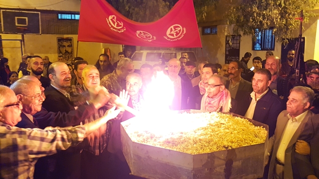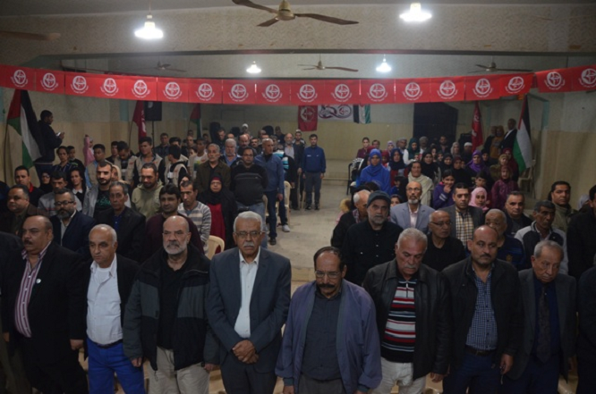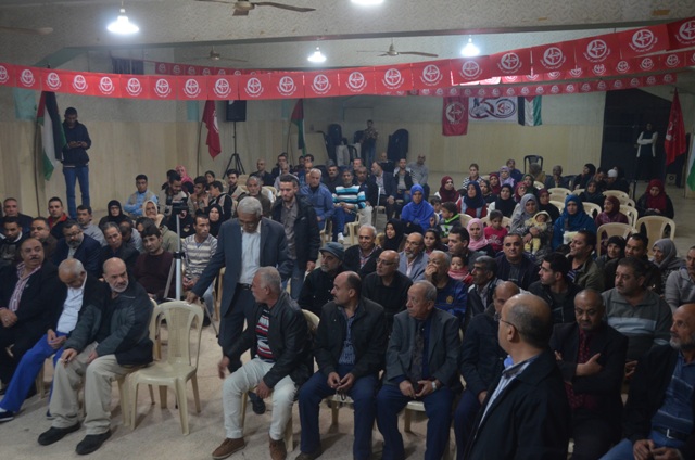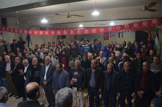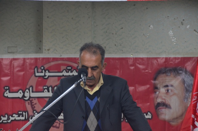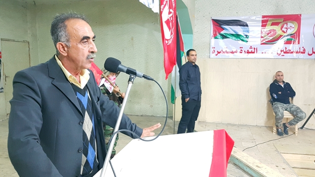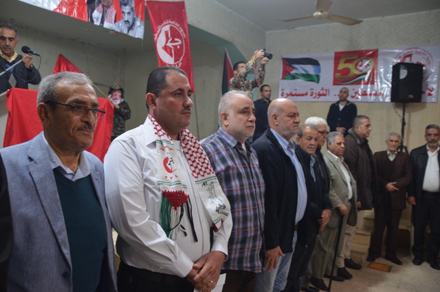 كلمة الجبهة ألقاها عضو لجنتها المركزية العامة هيثم عبده، استهلها بتوجيه التحية لكل الفدائيين، ولكل الشهداء الذين حفظوا وجه الأرض، تضاريسها، تلالها وسهولها كراحة أيديهم، شبرا شبرا وحجرا حجرا. رواد هذه المسيرة المظفرة على مدى خمسين عاما من النضال، خمسين عاما من العطاء والتضحية والالتزام، مشيرا إلى تجديد العهد اليوم للشهداء أولا، ولكل جماهير شعبنا، وقال: عانينا جميعا من سنوات التيه والضياع، وتعرضت قضيتنا للتبديد والتقزيم والتفريط، ألا يحق لنا بعد أكثر من عشرين عاما من التفاوض العبثي، أن يطلب جردة حساب، مراجعة سياسية شاملة؟ هل من المقبول أن نستمر بالمراهنة على خيار أوسلو؟ ألم يدخلنا مسار أوسلو في ضياع قضية اللاجئين؟ ألم يتضاعف الاستيطان ثلاثة أضعاف في الضفة؟ ما هو مصير الأسرى؟ وعددهم بازدياد مستمر. وما هو مصير القدس، والتي تحولت إلى مركز للاستيطان، وقد تضاعف عدد المستوطنين فيها مرات. وفلسطينيو الأراضي الفلسطينية المحتلة عام 48، فإنهم يتعرضون لأوسع حملة حصار وضغط، عبر سن القوانين العنصرية التي تحرمهم من لغتهم، من رفع الأذان، تسلبهم ممتلكاتهم التي كانت تسمى أملاك الغائبين، عدا عن تغيير أسماء الشوارع العربية إلى عبرية، منع إحياء مناسبات وطنية ومنها يوم النكبة.