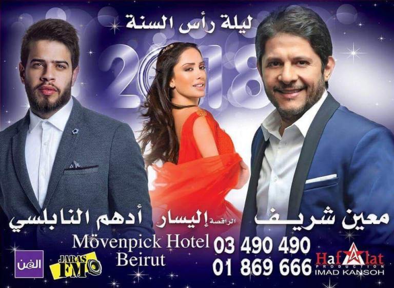 كما يحيي الفنانان معين شريف وأدهم نابلسي حفلاً فنياً بمناسبة رأس السنة الجديدة، في أوتيل الموفنبيك – بيروت، كما ستشارك في الحفل الراقصة إليسار.