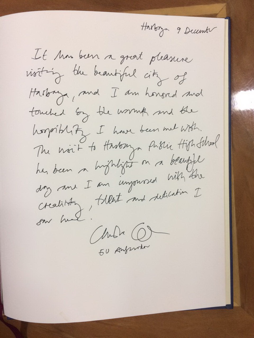 واختتم الحفل بتدوين كل من السفيرة ومعالي النائب كلمة في السجل الذهبي للثانوية .