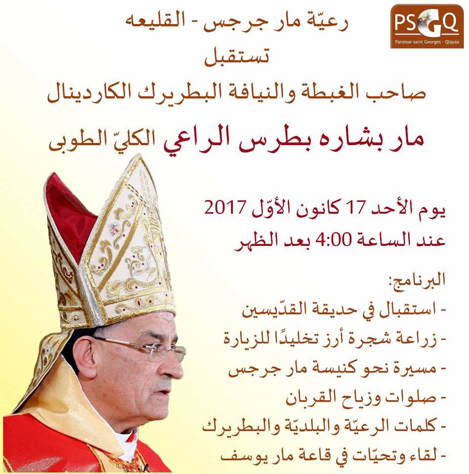 تتبارك مجدداً منطقتنا بزيارة غبطة البطريرك مار بشارة بطرس الراعي المقررة عصر يوم الاحد القادم (في 17-12-2017)، حيث سيتم استقباله في بلدة القليعة من قبل رعيّة مار جرجس عند الساعة الرابعة بعد الظهر.
