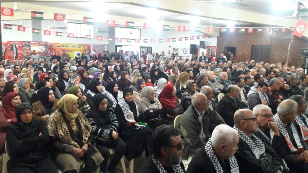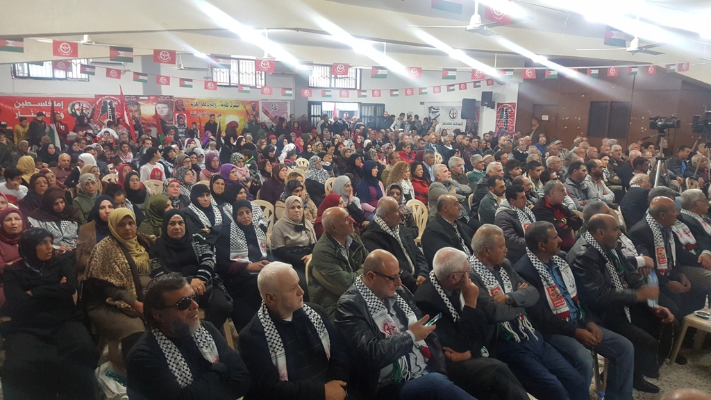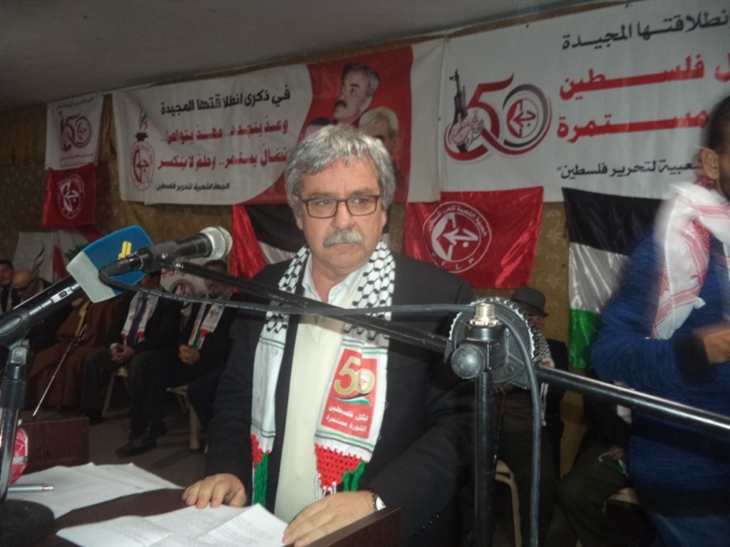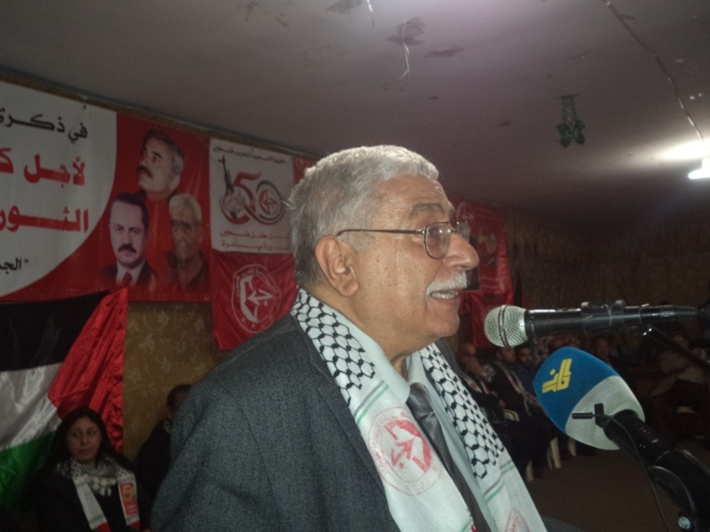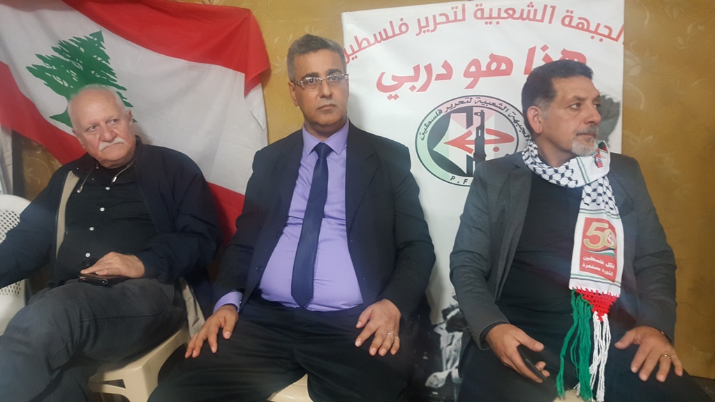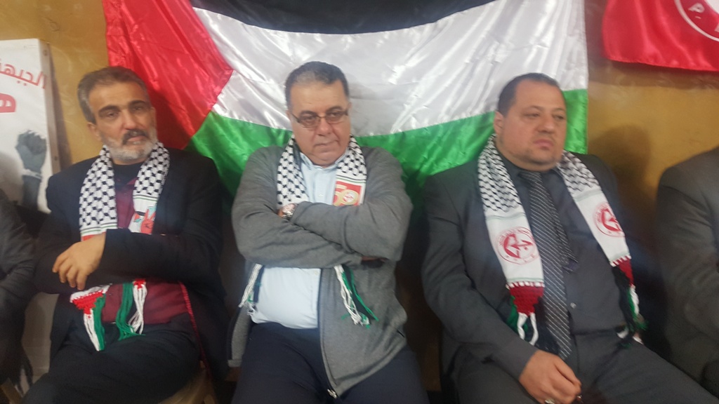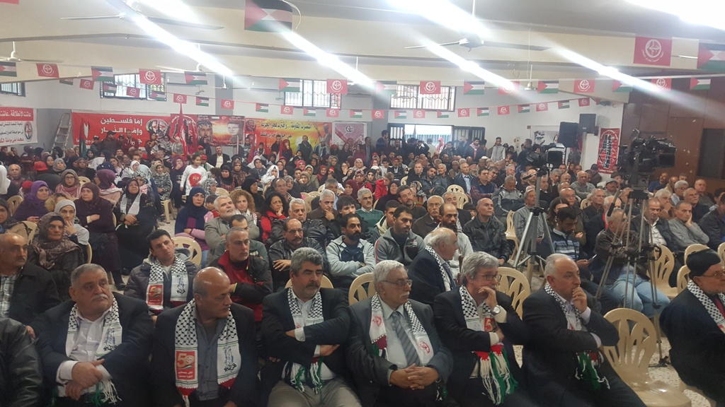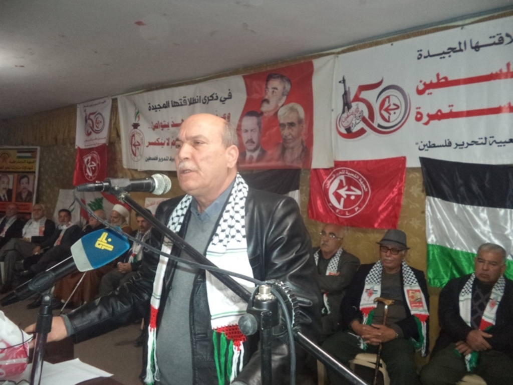 مشيرًا في كلامه إلى أن الخطر الصهيوني لا يمس فلسطين فحسب، بل يمس الأمة بأسرها، و ها هي الجماهير العربية خرجت بأغلبية العواصم العربية ، لتؤكد ارتباطها العميق والوثيق بالقضية الفلسطينية، على رغم تواطؤ النظام الرسمي العربي، لذلك لا بد من استعادة البعد العربي، والقومي للقضية الفلسطينة. كما أشار إلى أن الجبهة الشعبية ربطت ما بين التحرر و المضمون الاجتماعي، فالثورة حتى تنتصر، فهي تعتمد على أبناء المخيمات، على الفقراء، على الكادحين، والمسحوقين المرتبطين بالثورة، وأهداف الثورة حتى النهاية، لأنه أمام هذا الوضع الصعب يتضح أن هناك استحالة للوصول إلى حل سياسي مع هذا الكيان. وبعد قرار ترامب، نقول: إن أمريكا لم تعد وسيطًا نزيهًا ، وهي لم تكن في يوم من الأيام وسيطًا نزيهًا، مشيرا إلى أن الجبهة الشعبية تريد توحيد الصفوف، مؤكدًا على أن هذا الكيان الصهيوني، يقوم بالقضاء على الشعب الفلسطيني بأكمله، مشيرا إلى ضرورة ترميم البيت الفلسطيني، من خلال الإعلان الواضح والصريح بإلغاء اتفاقات أوسلو، وكل ما ترتب عنها من نتائج و مصاعب، وعلى السلطة أن تدفن اتفاق أوسلو الميت، وسحب الاعتراف بالكيان الصهيوني، والاعتراف بإسرائيل من قبل السلطة الفلسطينية، كما يجب على الشعب الفلسطيني أن يعمل على أساس انتفاضة فلسطينية جذرية، متواصلة، وتشكيل قيادة وطنية موحدة، انتفاضة من كافة الفصائل الفلسطينية من دون استثناء، وممارسة كل أشكال النضال حتى نوصل الكيان الصهيوني لقناعة أن استمرار احتلاله لأرضنا مكلف بشريا واقتصاديا، وأنه ليس أمامه إلا الرحيل، وإعادة الاعتبار لمنظمة التحرير الفلسطينية، وإعادة بناء مؤسساتها، وكل ما ينبثق عنها من أطر، لكي نستنهض طاقات 6.5 مليون فلسطيني في الشتات الذين يشعرون بأنه ليس لديهم مرجعية، ولا وجود لمن يحميهم، والعمل على عقد مجلس وطني شامل، بعيدا عن سطوة الاحتلال، وليس في رام الله، تشارك فيه كل القوى من دون استثناء، استعادة الوحدة الوطنية الفلسطينية الحقيقية، و ببرنامج يعيد الاعتبار لمعنى فلسطين من النهر إلى البحر، لا شرعية لهذا الكيان على أي بقعة من فلسطين.