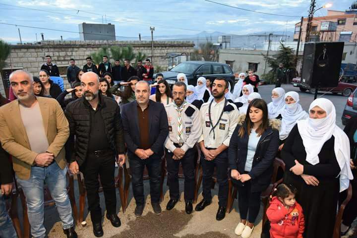 استهل الاحتفال بالنشيد الوطني اللبناني، فكلمة ترحيبية بإسم فوج عين قنيا في جمعية الكشاف الديمقراطي ألقاها القائد رامي أبورافع.