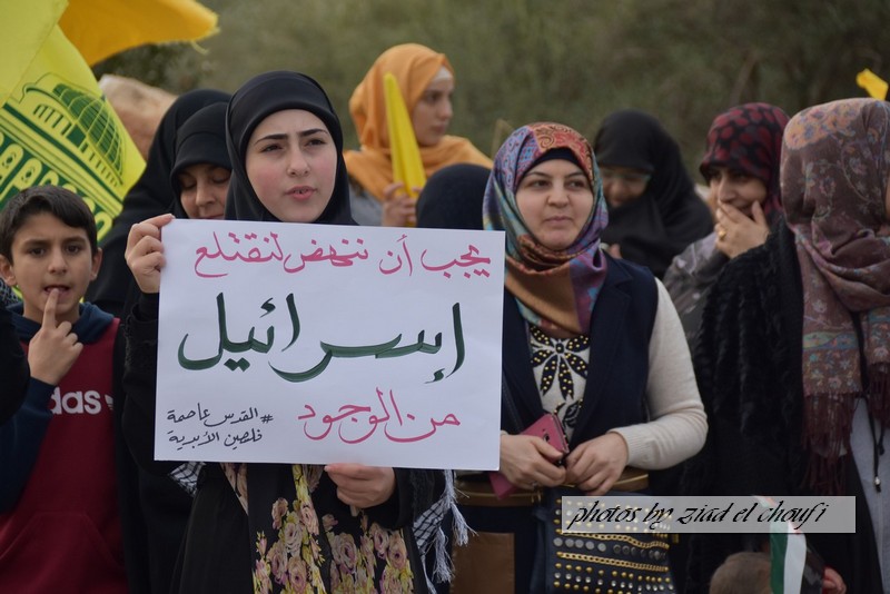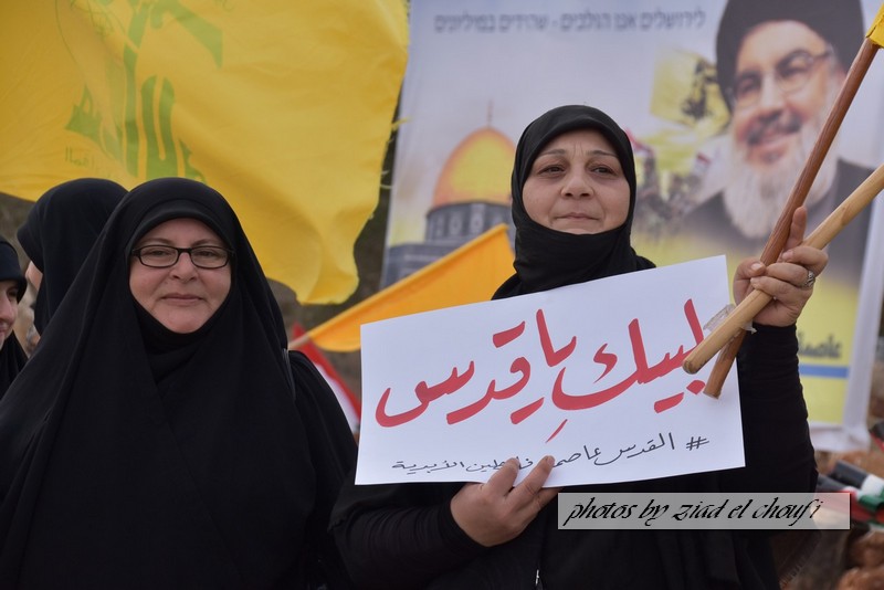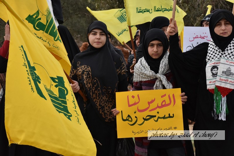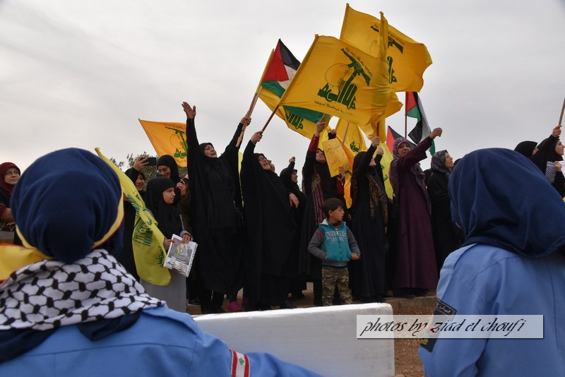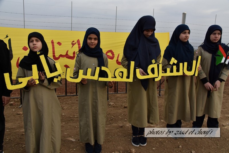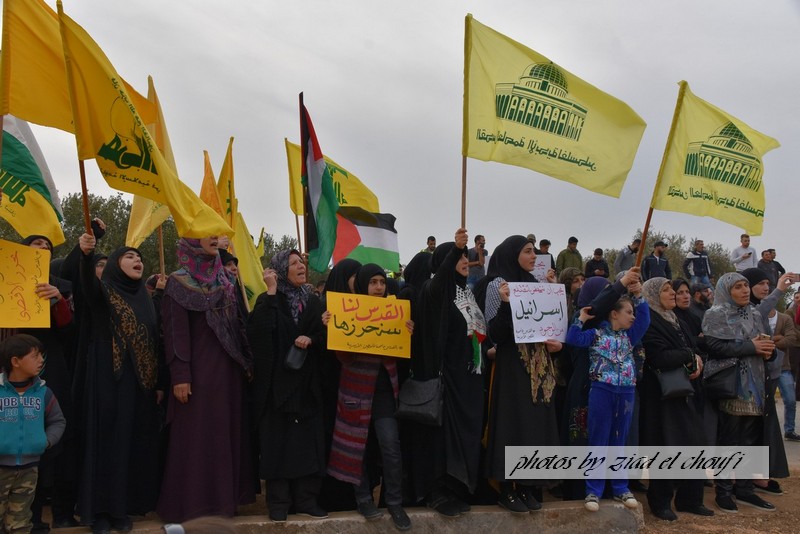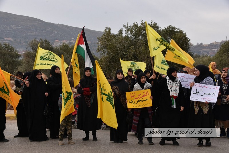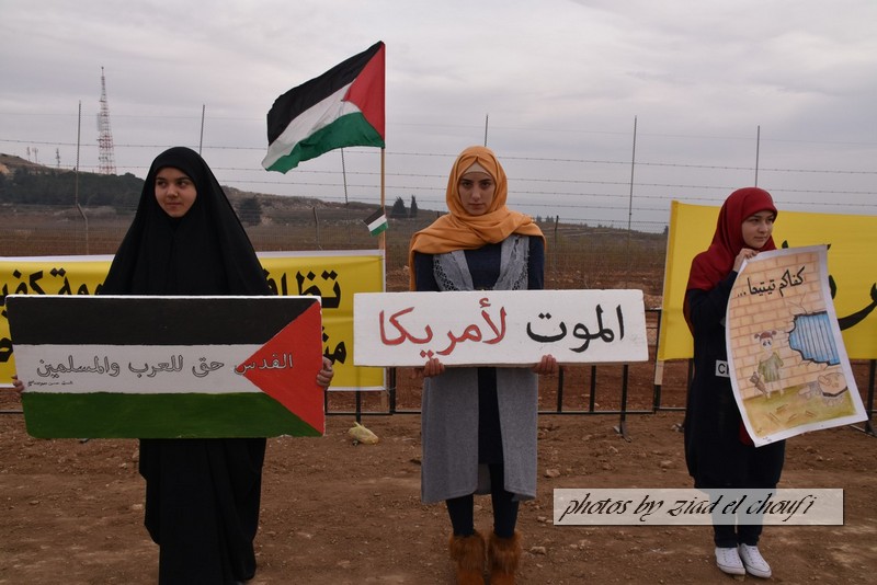 نظم حزب الله، وقفة تضامنية نصرة للاقصى والقدس، في كفركلا عند جدار فاطمة على الحدود بمحاذاة السياج التقني الفاصل بين لبنان والاراضي الفلسطينية المحتلة، بمشاركة فعاليات منطقتي مرجعيون وحاصبيا، احتجاجا على قرار الرئيس الاميركي دونالد ترامب بالاعتراف بالقدس عاصمة لكيان العدو الاسرائيلي، تقدمهم النائبان قاسم هاشم وعلي فياض، رجال دين من مختلف الطوائف، رؤساء بلديات ومخاتير المنطقة، ممثلون عن القوى والاحزاب السياسية، ووفود شعبية من قرى وبلدات المنطقة، والهيئات النسائية في حزب الله، وقد حمل المشاركون اعلام لبنان وفلسطين ورايات حزب الله والقدس ولافتات منددة بالقرار الاميركي كما هتفوا ضد اميركا واسرائيل واحرقوا علميهما.