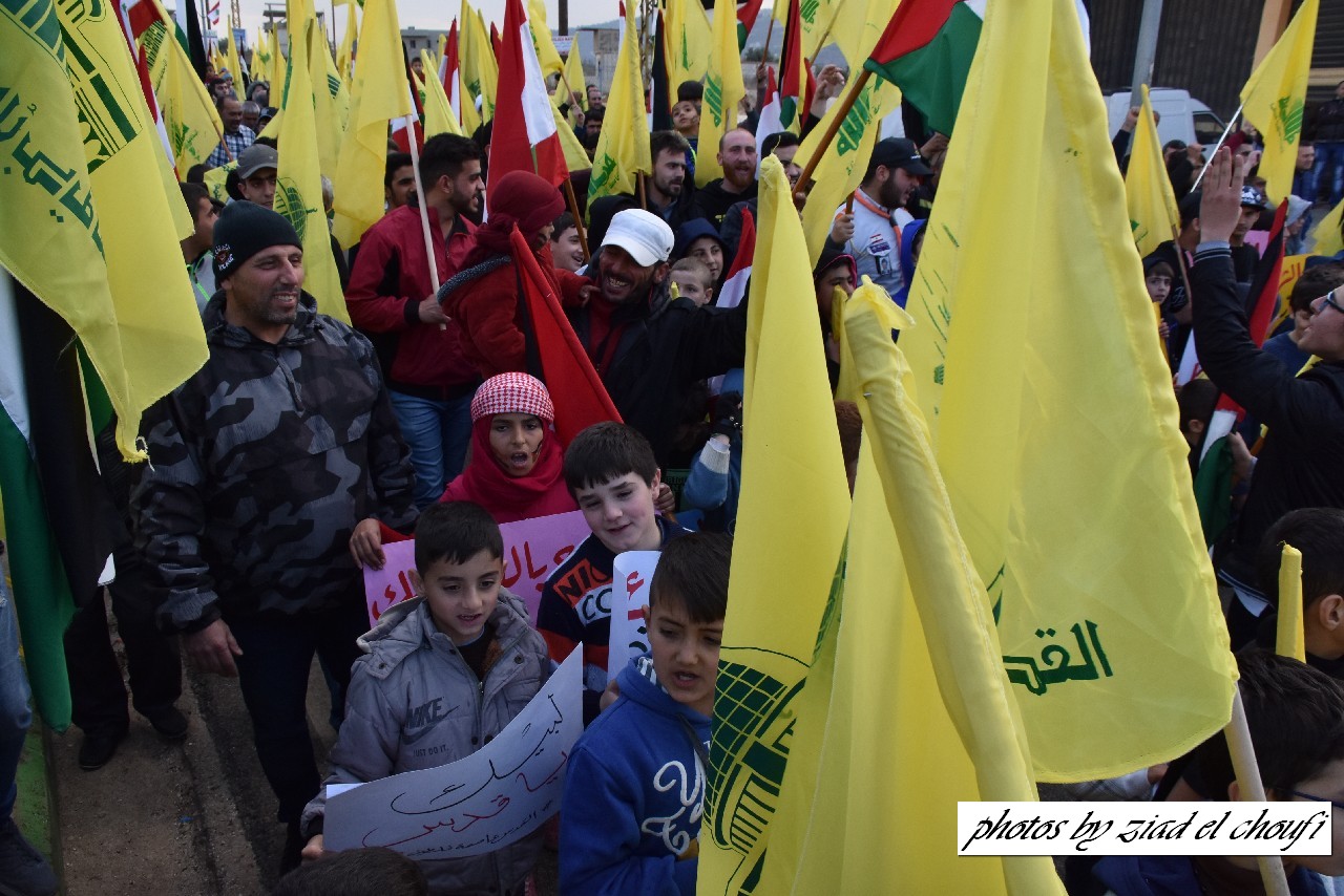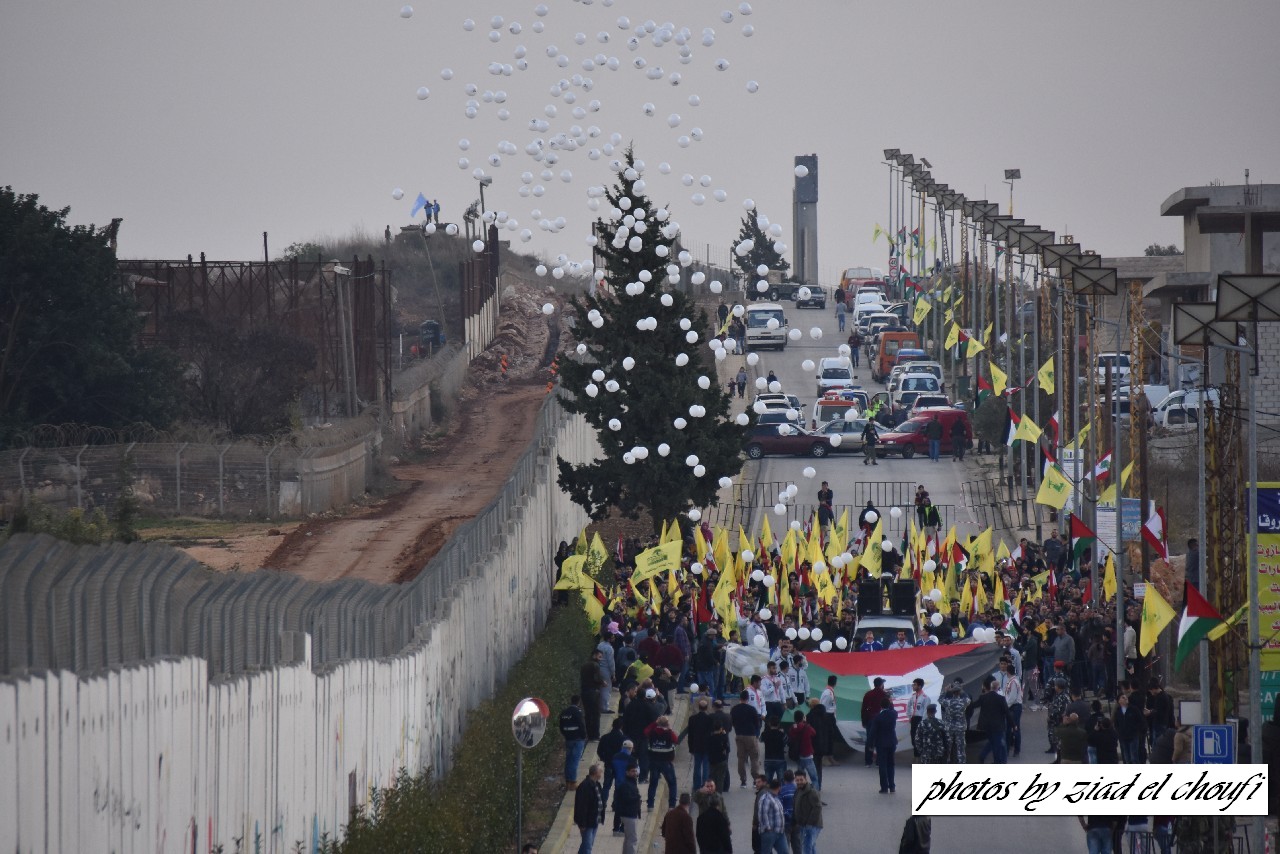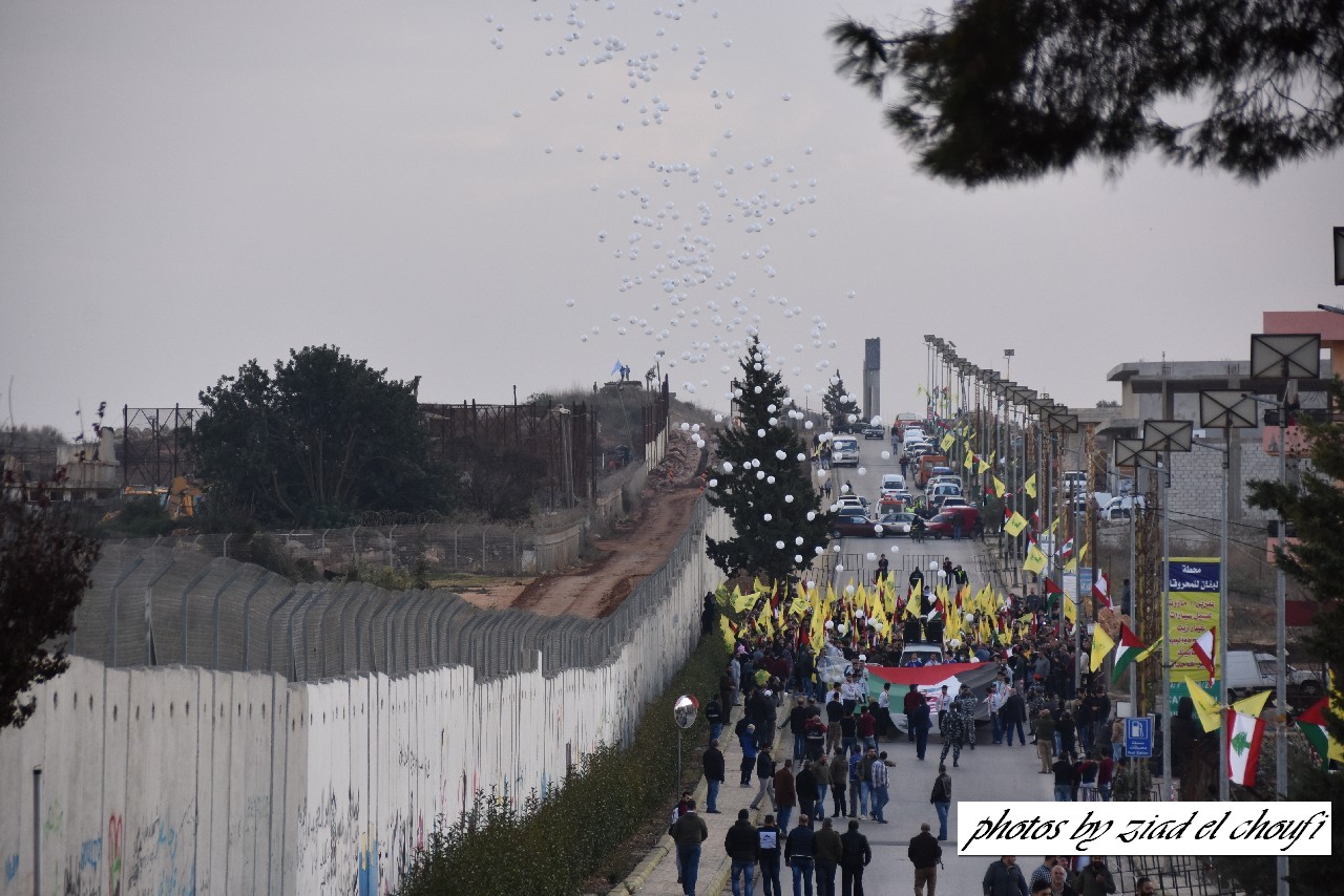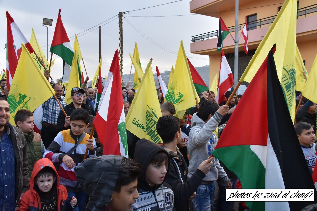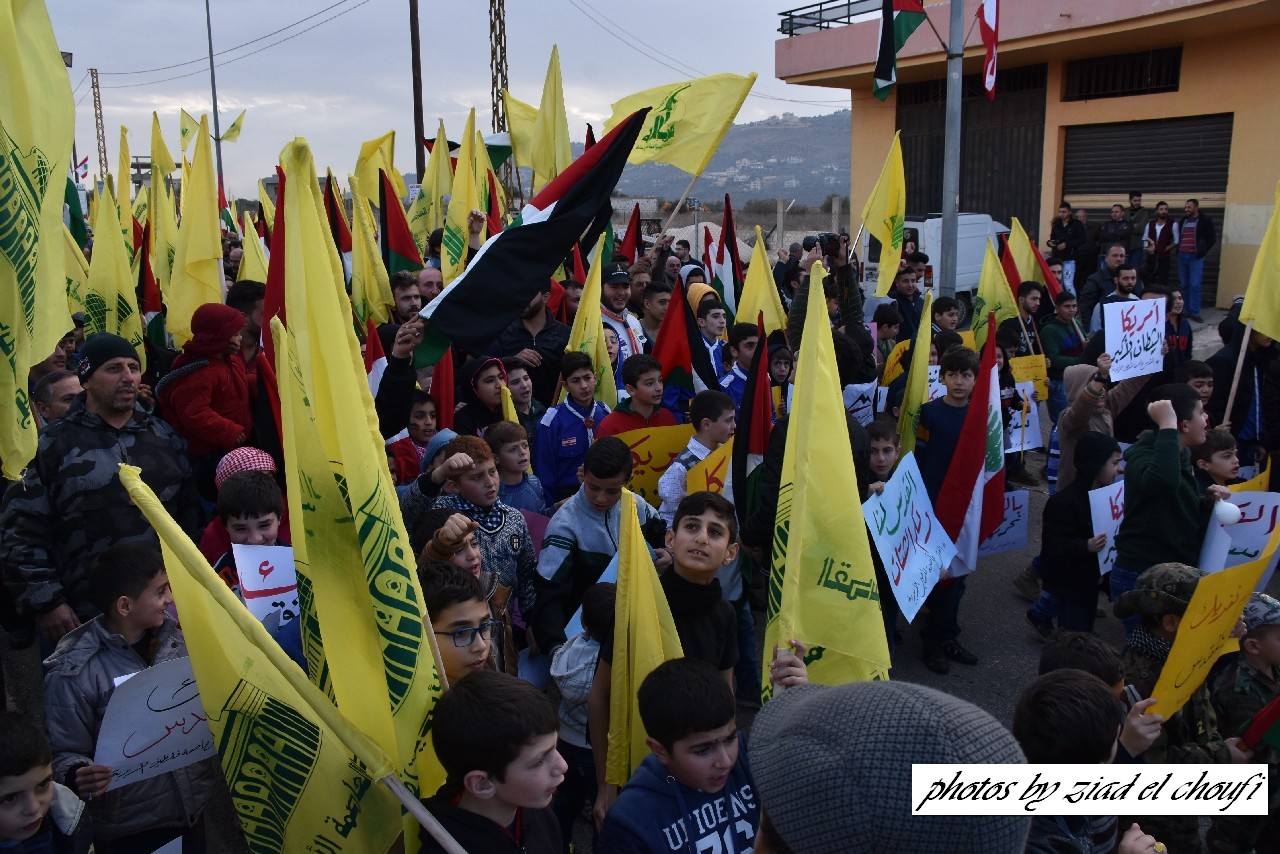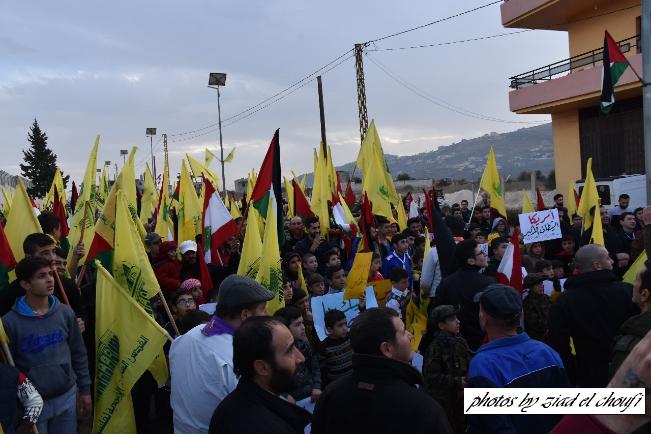 اقام حزب الله تظاهرة عند الحدود بمحاذاة جدار فاطمة نصرة للقدس الشريف وفلسطين ، حملت عنوان القدس عاصمة أبدية لفلسطين ، شارك فيها الشيخ حسن عز الدين مسؤول العلاقات الخارجية في حزب الله ، رئيس اتحاد بلديات جبل عامل علي الزين وعدد من رؤساء بلديات ومخاتير الاتحاد، ورجال دين وأئمة وفاعليات وممثلي القوى والاحزاب السياسية في المنطقة وعوائل الشهدا، وحشد من المواطنين القادمين من مختلف قرى جبل عامل حاملين الاعلام اللبنانية والفلسطينية ورايات حزب الله وعلم كبير لفلسطين ، وسط إجراءات امنية مشددة للجيش وقوى الامن في مكان الاحتفال حفاظا على السلامة العامة ومراقبة من قوات اليونيفيل وفريق مراقبي الهدنة الدوليين، ومراقبة من داخل الحدود لجنود العدو بواسطة الكاميرات المنتشرة على طول الجدار، الذي سبق أن اطلق (العدو) إرهابا قنبلتين صوتيتين باتجاه عدد من الشبان قاموا بالاقتراب من السياج التقني .قبل بدء التظاهرة.