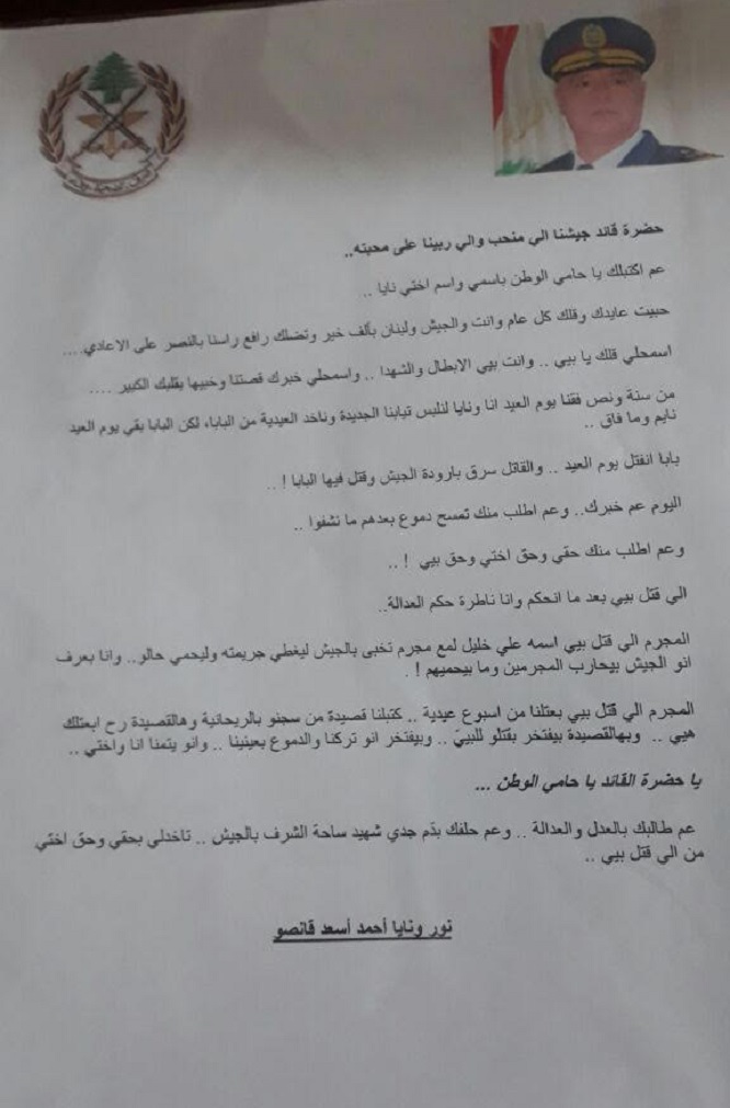 عم طالبك بالعدل والعدالة .. وعم حلفك بدّم جدي شهيد ساحة الشرف بالجيش .. تاخدلي بحقي وحق اختي من الي قتل بيي ..