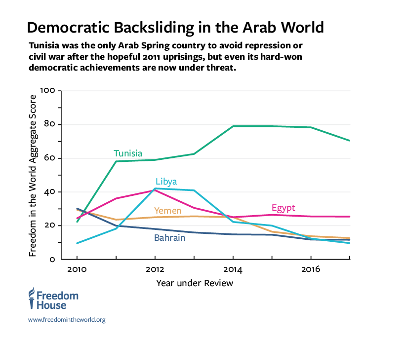 وذكرت المنظمة في تقريرها لعام 2018 أن تأجيل الانتخابات البلدية في تونس وتمديد فترة الطوارئ، بالإضافة إلى تعرض النظام السياسي الحالي للمزيد من الضغوط من عناصر نظام الرئيس التونسي السابق زين العابدين بن علي، أدى إلى انخفاض معدل نقاط الحرية التونسي إلى 70 نقطة من 78 العام الماضي.