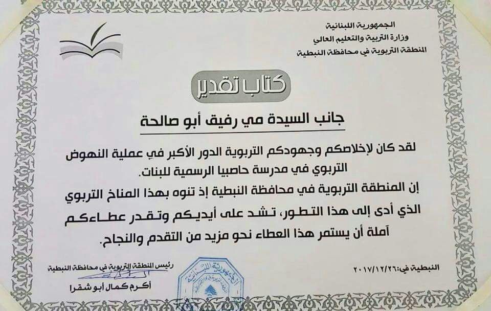 تقديراً لعملهم الدؤوب في إعلاء الشأن التربوي عبر تعزيز المدرسة الرسمية للبنات في حاصبيا ولنشاطاتهم المميزة مع الطلاب بإستخدام أساليب حديثة ومتطورة في عملية التربية والتعليم كرمت المنطقة التربوية في محافظة النبطية بشخص رئيس المنطقة الاستاذ أكرم ابو شقرا المعلمتان رانيا عماشة ومي أبو صالحة>