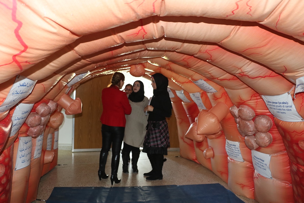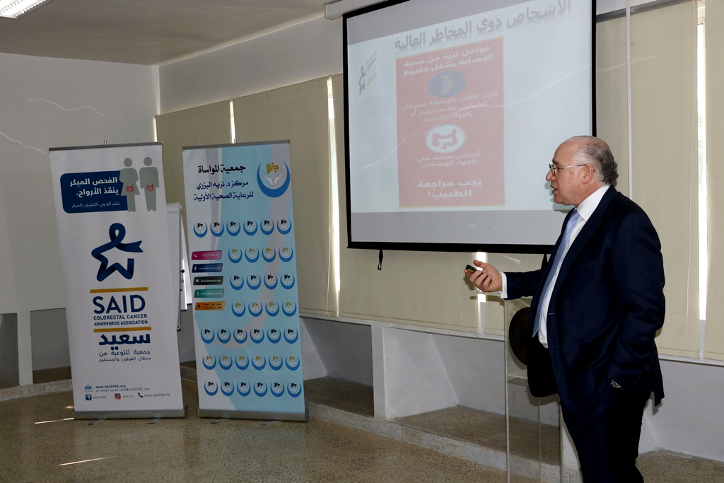 ثم القى الدكتور سامر دوغان المتخصص في الجراحة وأمراض الجهاز الهضمي محاضرة حول مرض سرطان القولون وكيفية الوقاية منه مشدّداً على ضرورة إجراء الفحص السنوي للوقاية منه حيث انه يصيب 1 من 20 شخص، وهو في معظم الأوقات لا عوارض له إلا بعد انتشاره وصعوبة القضاء عليه.
