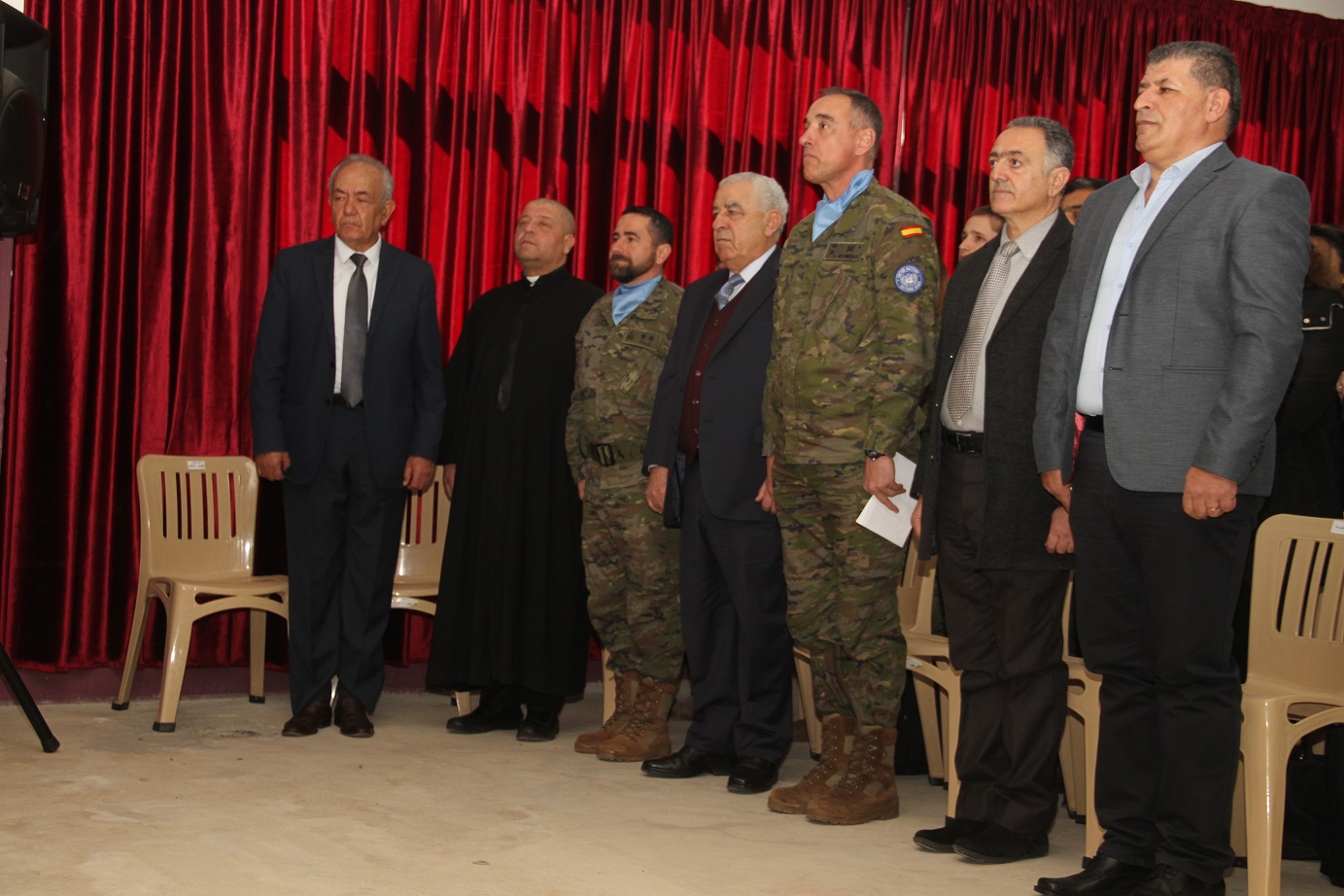 بعد النشيد الوطني الذي عزفه الطلا بقيادة الاستاذ جورج نهرا ونشيد المملكة الاسبانية، وعرض فيلم وثائقي عن مراحل الانجازات التي حققتها الادارة في المدرسة، القى ممثل رئيس البلدية الاستاذ يوسف الخوري كلمة، شكر فيها الكتيبة الاسبانية على دعمها المستمر للمدرسة الرسمية ومنوها بادارتها التي تعمل من اجل تحسين مستوى التعليم الرسمي فيها.
