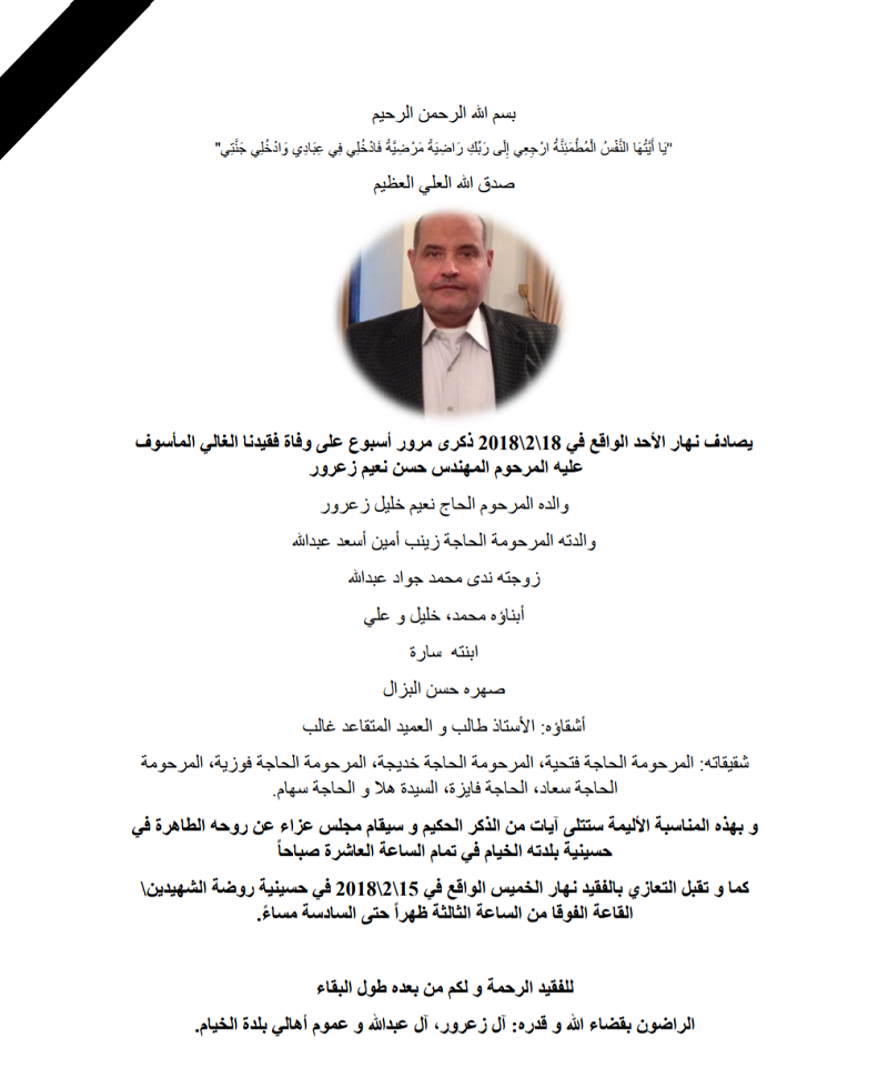 ويُصادف نهار الأحد ٢٠١٨/٢/١٨ ذكرى أسبوع المرحوم
