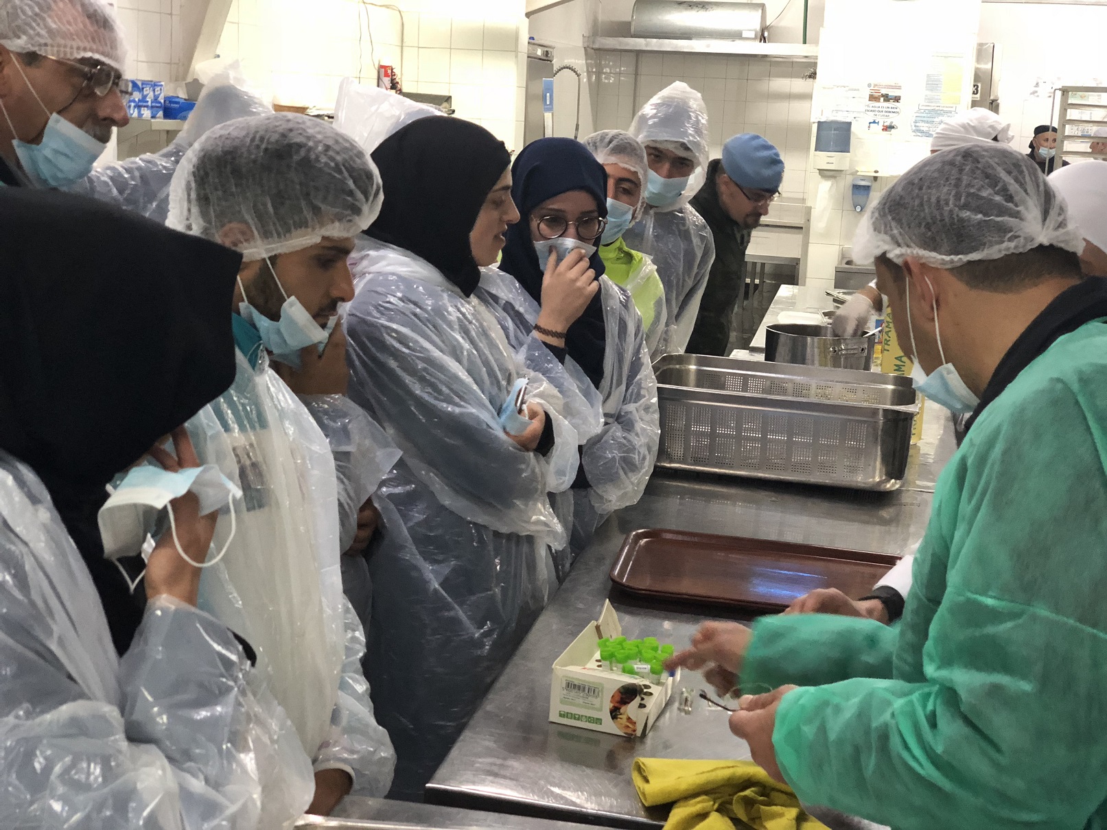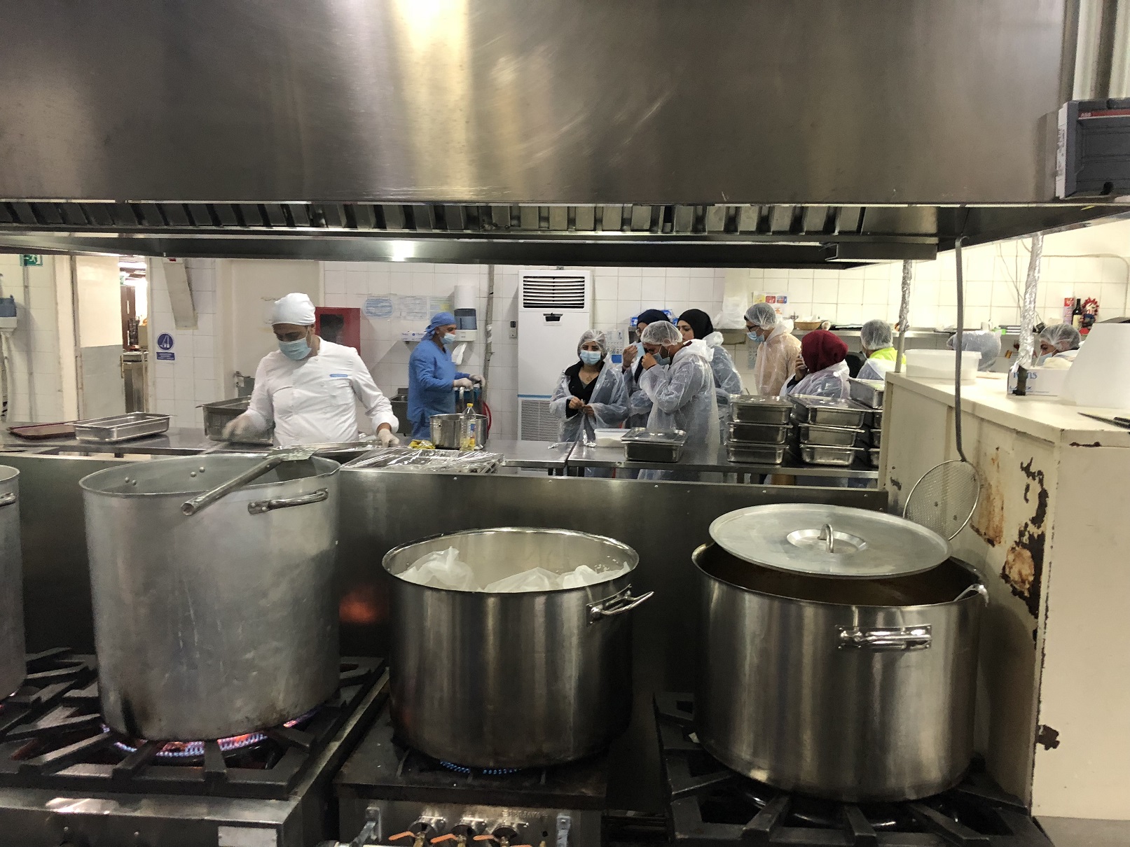 كما وتم اطلاعهم على مطابخ غرفة الطعام الرئيسية والكافيتيرية، حيث قام اخصائيون بشرح كيفية تشغيل مطبخ صناعي ومطبخ مطعم للطلاب، وعلى التوالي، تم تعريفهم على المراحل التي تمر بها المواد الغذائية منذ وصولها الى المخازن والى حين تقديمها على موائد الطعام.