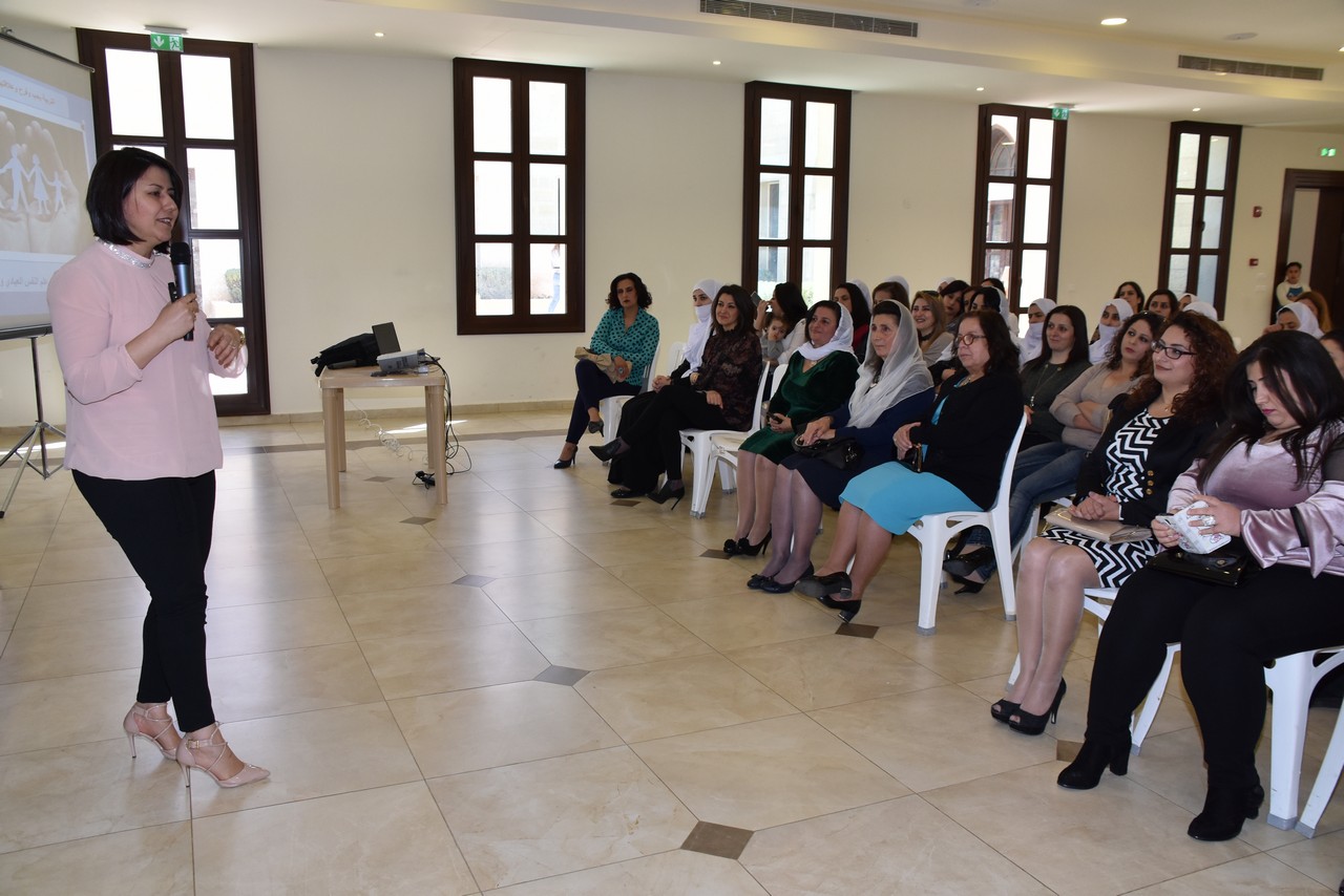بعدها حاضرت الاخصائية في علم النفس العيادي والتوافقي السيدة دلال الحلبي عن دور الاسرة في نجاح الطفل مستقبلياً وعن دور الام والاب وأهمية المشاركة والتوازن في عملية التربية وعدم اقتصار دور الاب على العمل خارج المنزل ، وعلى العمل للتنبه لمشاكل الطفل قبيل وقوعها والعمل على تفاديها وللمدرسة هنا دور بالمساعدة ويبقى الدور الاكبر للاهل في التربية والتوجيه منذ الصغر ، كما تحدث عن العقد الثلاث الاهم في حياتنا وطريقة التحكم بها (الفصام، الدخيل وعقدة أوديب ) . كما اكدت أن الاقلال كما الافراط في الاهتمام يولد المشاكل للطفل ، فالوسطية هي انجع الحلول ، وضرورة افساح المجال له للاتكال على نفسه لبناء شخصيته القوية والتدخل عند الحاجة فقط ، كما شرحت عن انواع الذكاء الاجتماعي واهمية اعتماد لغة التحاور والتواصل مع الطفل والمناقشة في كثير من الامور التي يحتاج لتفسيرات لها والتركيز على كلمات التشجيع التي لها الاثر الكبير في بناء شخصيته القوية
