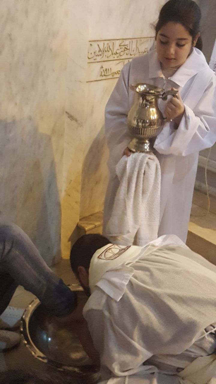 وبعد الإنجيل المقدس ، قام الأب فرح برتبة الغسل وغسل أرجل 12 طفلاً، تجسيداً لما قام به السيد المسيح مع تلاميذه ، حيث غسل أرجل تلاميذه ال 12 وقبّلها رمزاً للتواضع والمحبة.