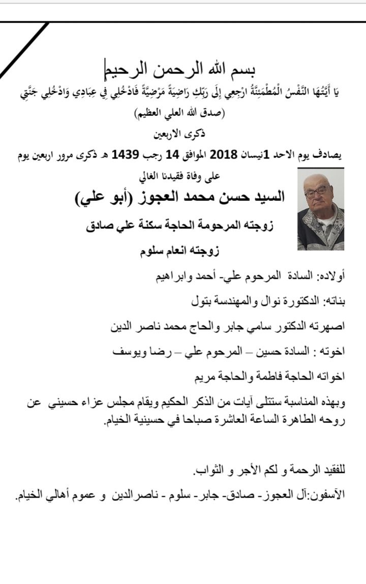يصادف نهار الاحد الواقع فيه 1 نيسان 2018 ذكرى أربعين فقيدنا الغالي الوالد المرحوم