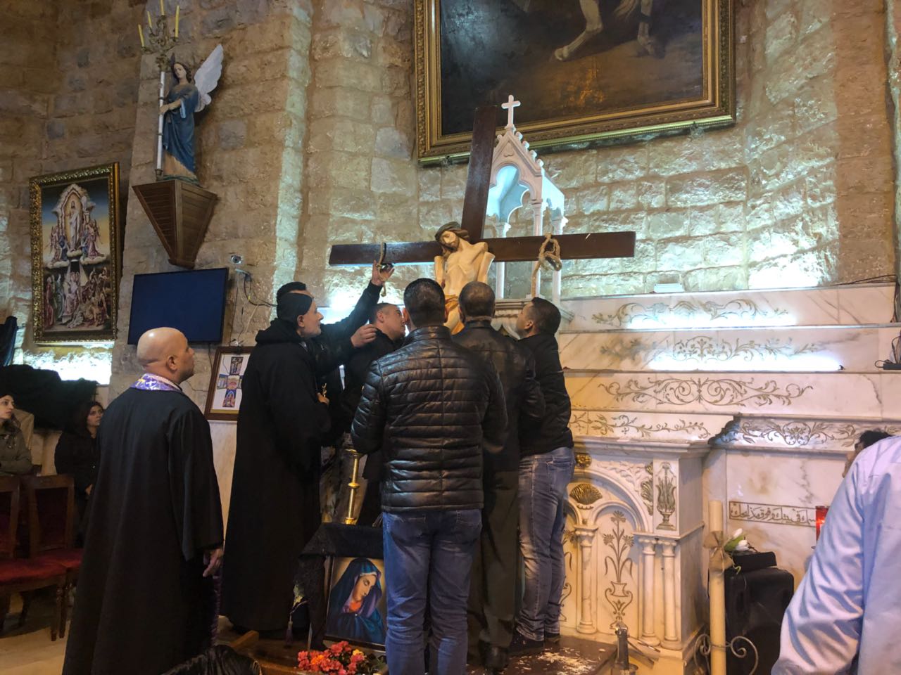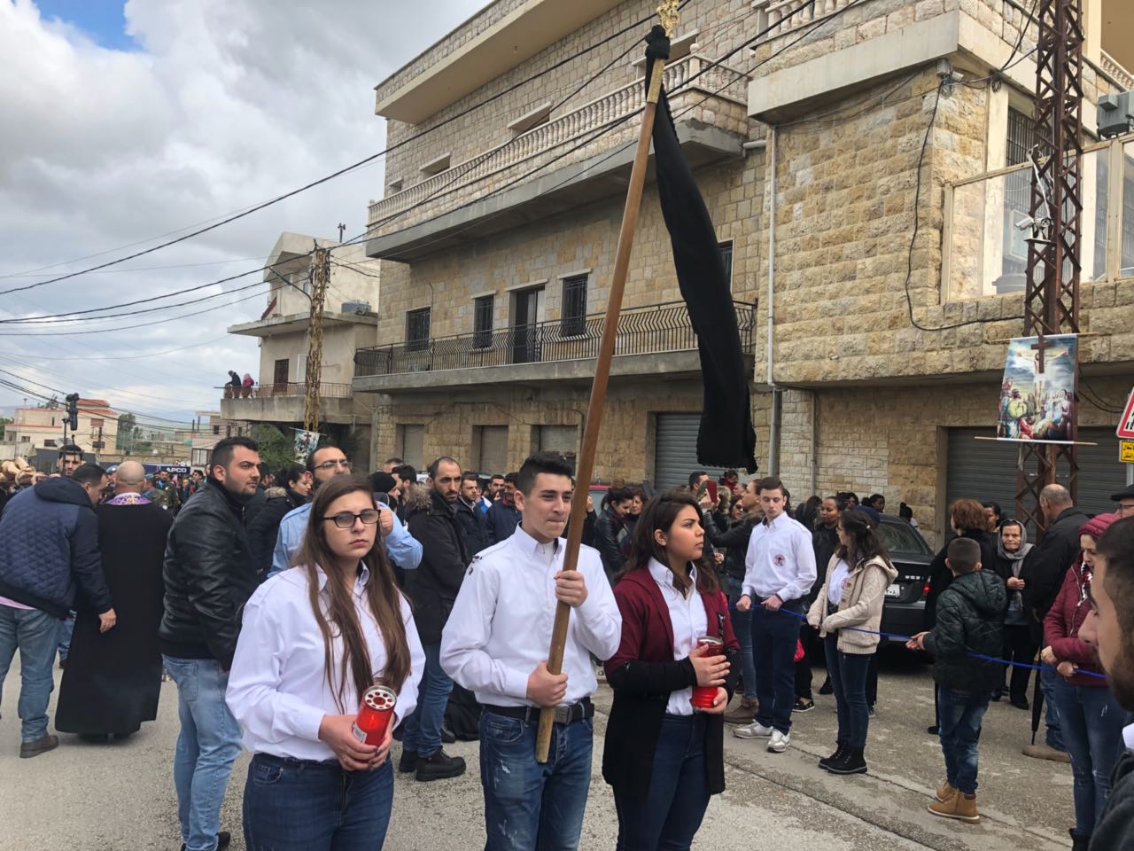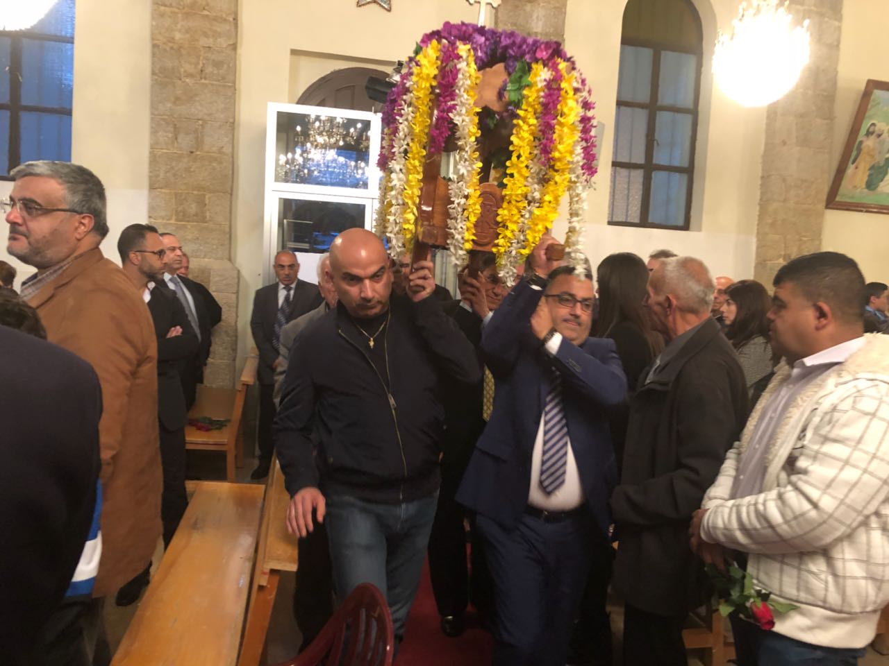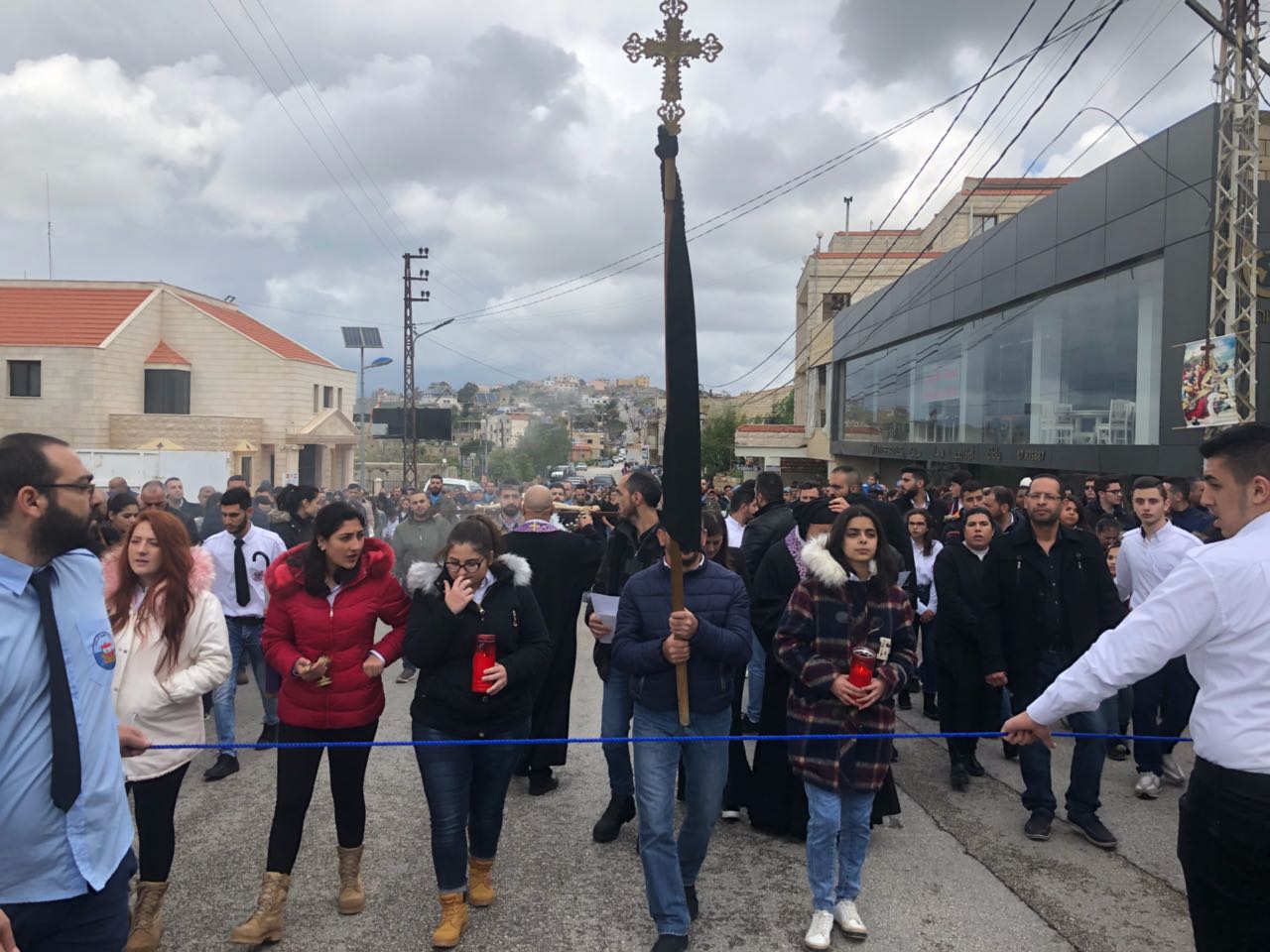 وشارك المؤمنون بتطواف الصليب، فجابوا الأحياء والشوارع الداخلية للبلدة، لإحياء آلام السيد المسيح، يتقدمهم كاهن الرعية الأب حنا الخوري والأب شربل برقاشي، على وقع التراتيل وموسيقى الفرقة الأسبانية. وتوجهت المسيرة إلى الكنيسة الإنجيلية الوطنية وسط البلدة، ومنها إلى كنيسة القديس جاورجيوس للروم الأورثوذكس، ثم انتقلت إلى كاتدرائية القديس بطرس للروم الكاثوليك، واختتمت مراحل آلام السيد المسيح في كنيسة سيدة الخلاص المارونية برتبة دفن المصلوب.