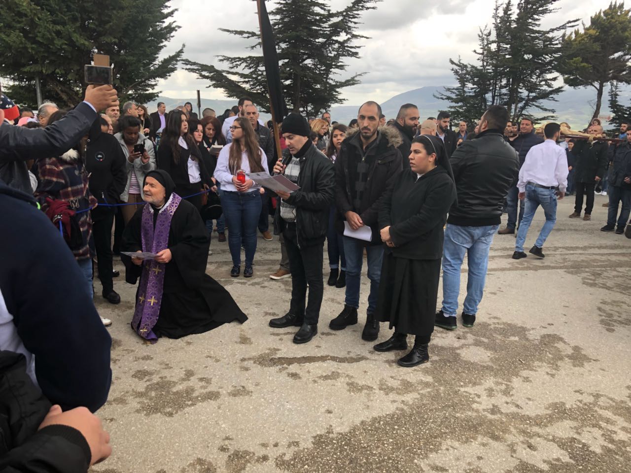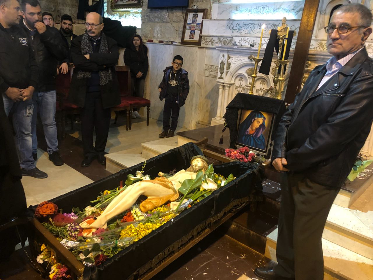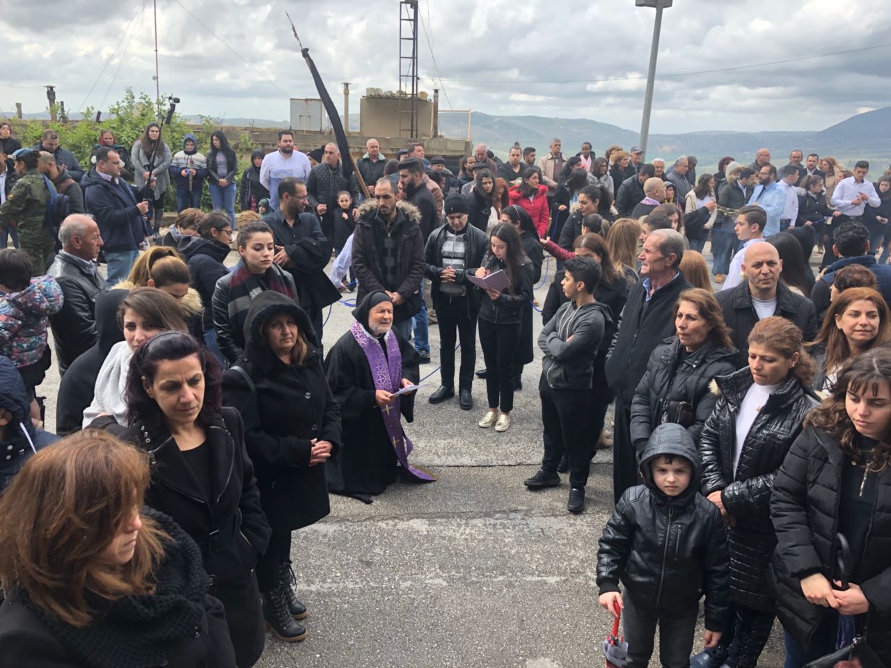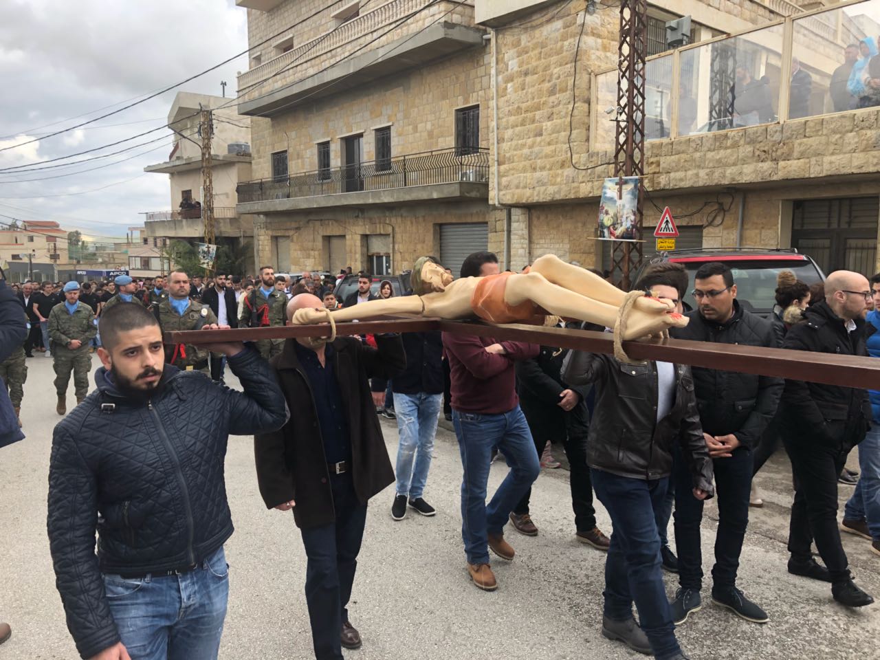 وشارك المؤمنون بتطواف الصليب، فجابوا الأحياء والشوارع الداخلية للبلدة، لإحياء آلام السيد المسيح، يتقدمهم كاهن الرعية الأب حنا الخوري والأب شربل برقاشي، على وقع التراتيل وموسيقى الفرقة الأسبانية. وتوجهت المسيرة إلى الكنيسة الإنجيلية الوطنية وسط البلدة، ومنها إلى كنيسة القديس جاورجيوس للروم الأورثوذكس، ثم انتقلت إلى كاتدرائية القديس بطرس للروم الكاثوليك، واختتمت مراحل آلام السيد المسيح في كنيسة سيدة الخلاص المارونية برتبة دفن المصلوب.