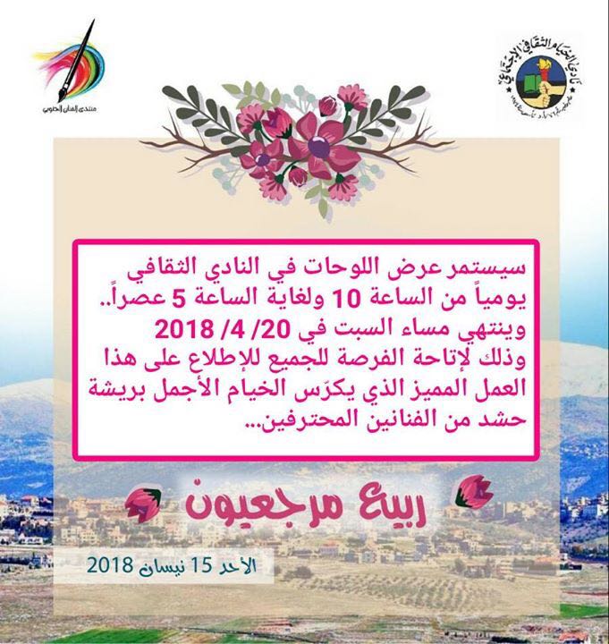 سيستمر عرض اللوحات المرسومة في نادي الخيام الثقافي لمدة خمسة أيام.. من الساعة 10 صباحاً ولغاية الساعة 5 عصراً.. وينتهي مساء السبت في 20/ 4/ 2018