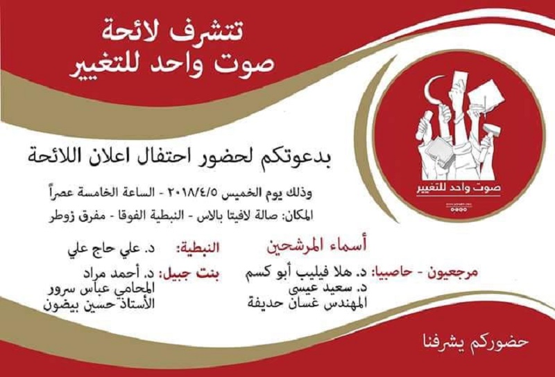 يتم عصر يوم الخميس 5 نيسان الجاري الإعلان عن لائحة «صوت واحد للتغيير» في دائرة الجنوب الثالثة للانتخابات النيابية بمهرجان يقام الساعة الخامسة في صالة لافيتا بالاس - النبطية الفوقا، ومن المتوقع أن يحضر المهرجان حشد من المناصرين والمؤيدين.