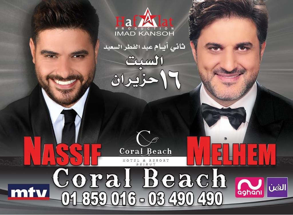 لمناسبة عيد الفطر السعيد، ينظم المنتج ومتعهد الحفلات الصديق عماد قانصو، حفلاً فنياً ضخماً من إنتاج شركة حفلات برودكشن، في في فندق ومنتجع كورال بيتش بيروت (Coral Beach Hotel & Resort Beirut)، يحييه نجمان من بين اهم الاسماء في عالم الفن، الفنانان ملحم زين وناصيف زيتون وذلك مساء يوم السبت الموافق 16 حزيران 2018.