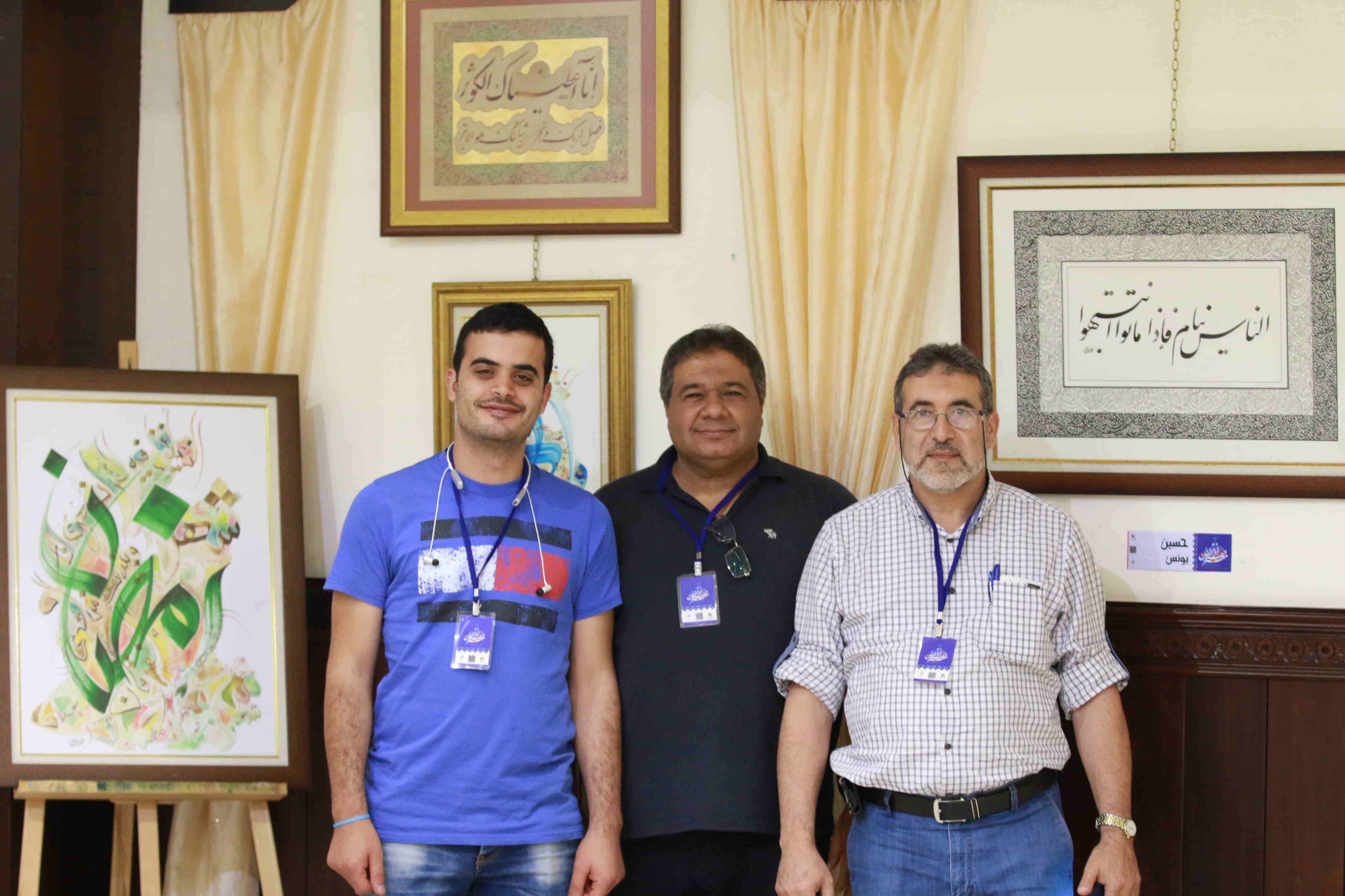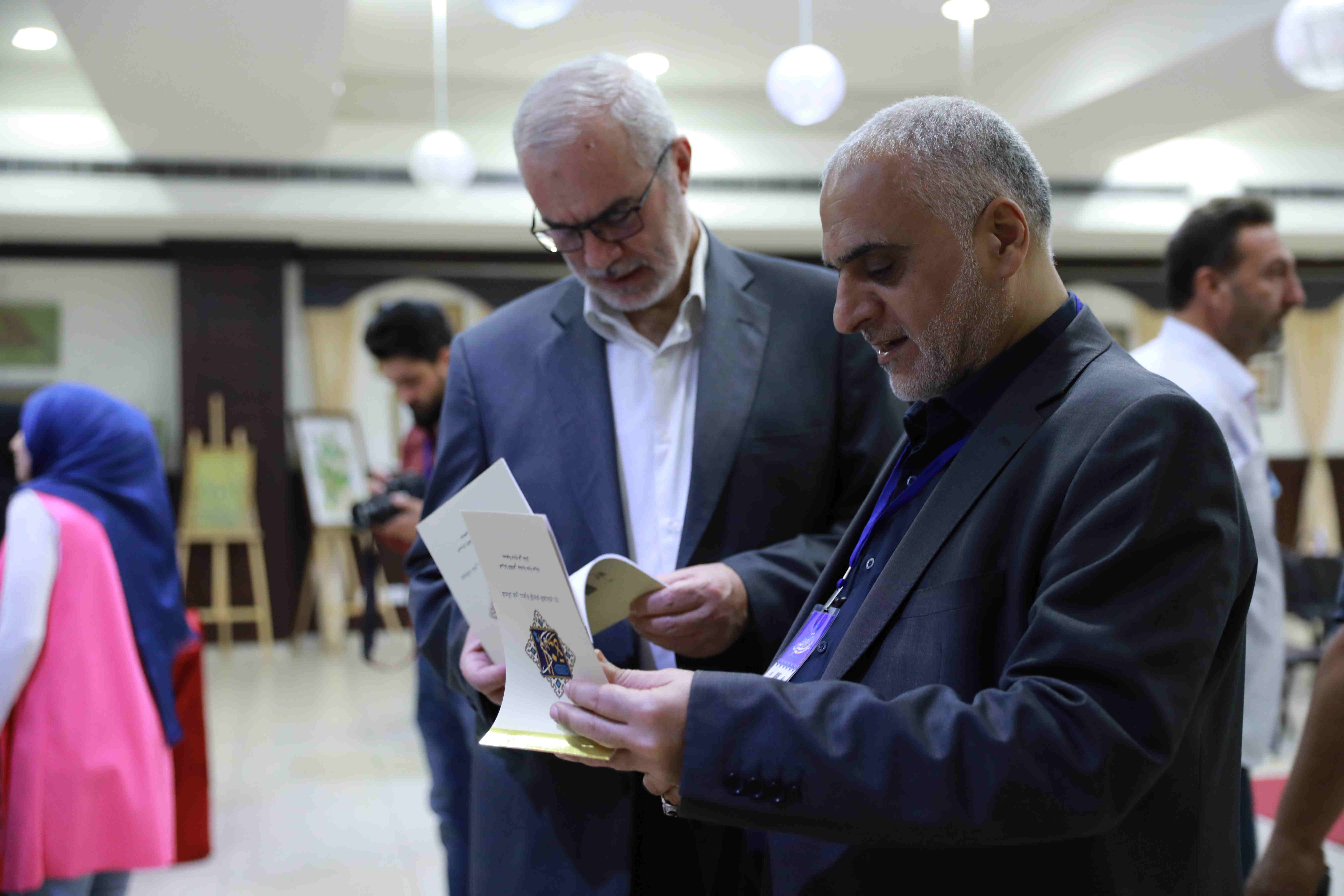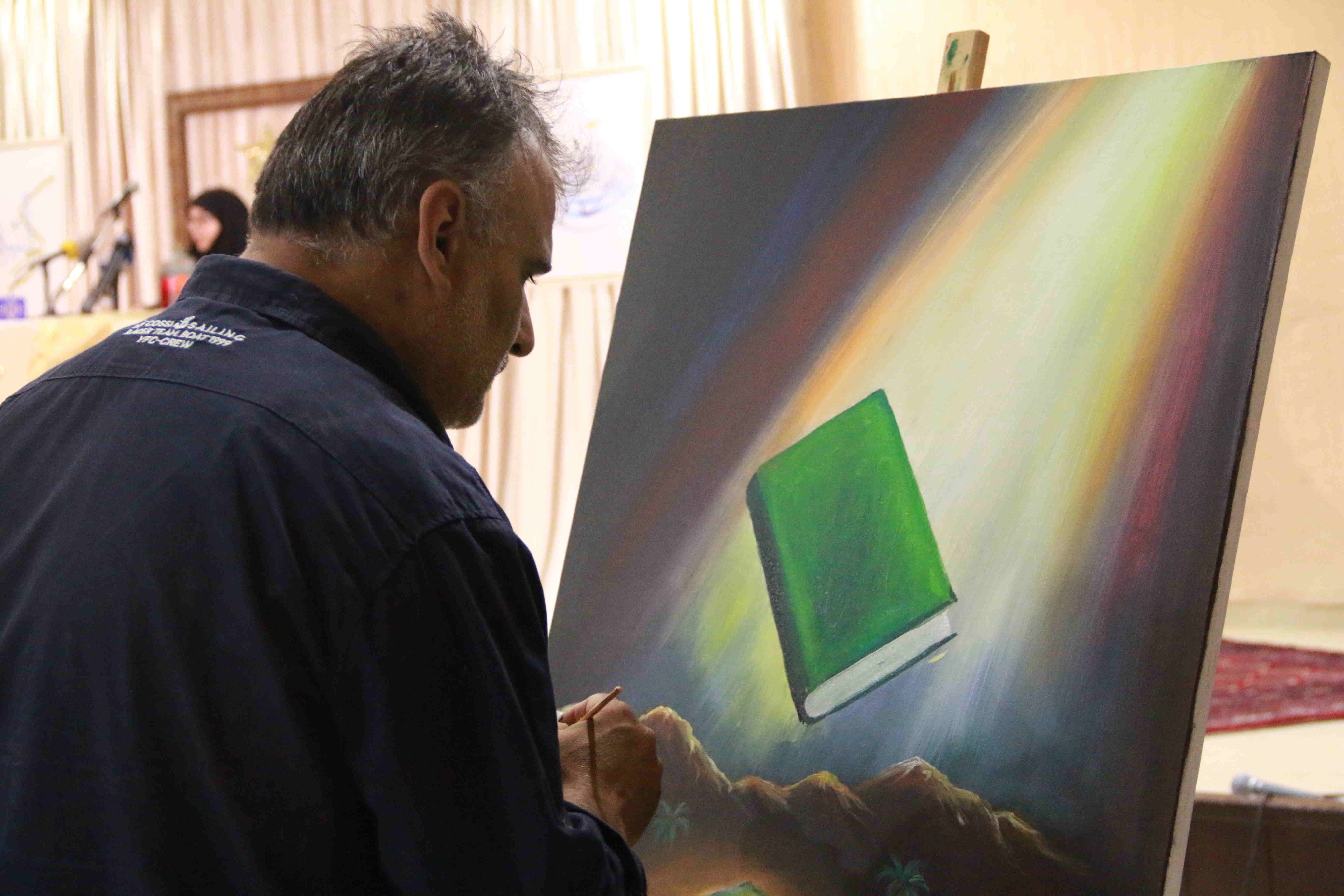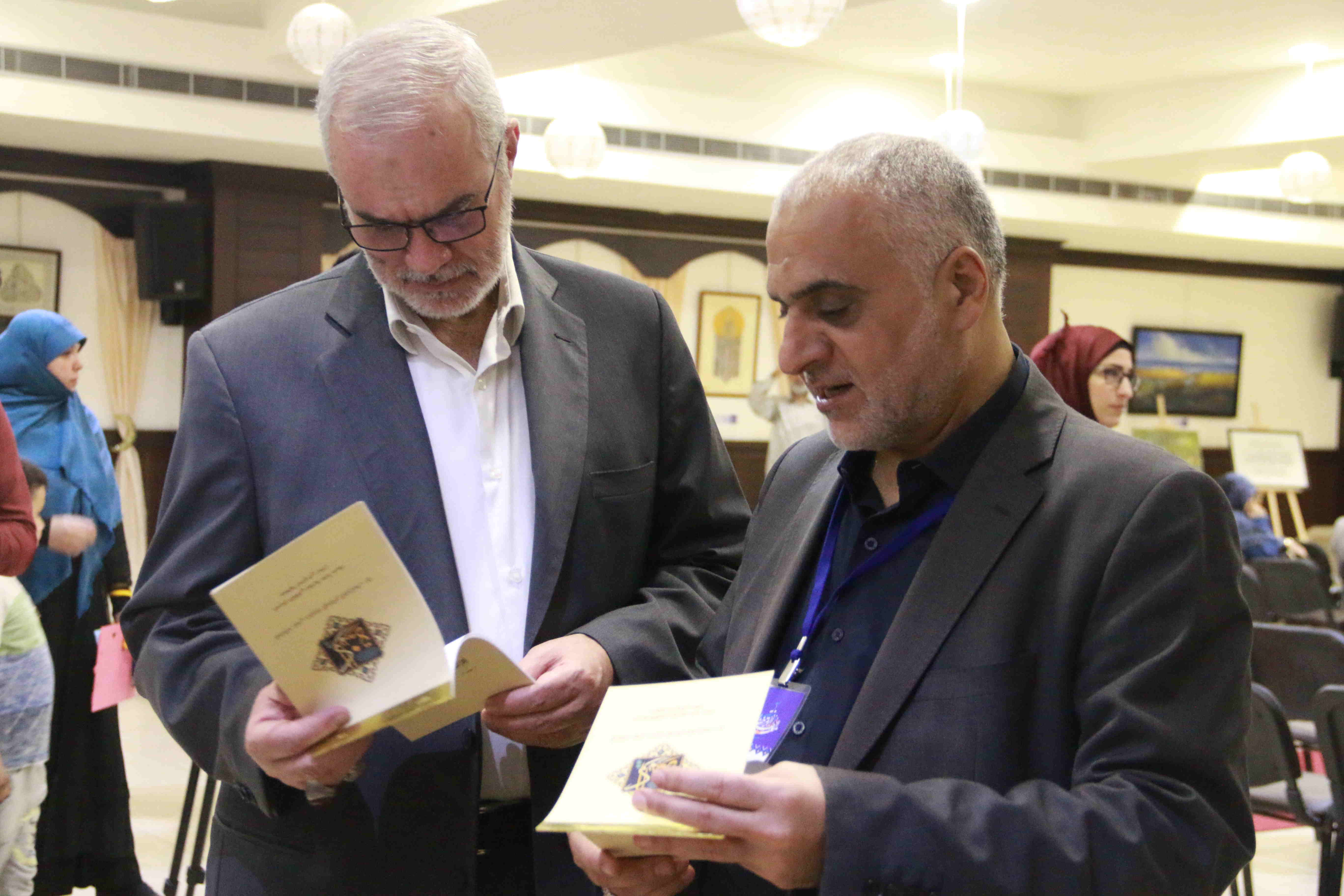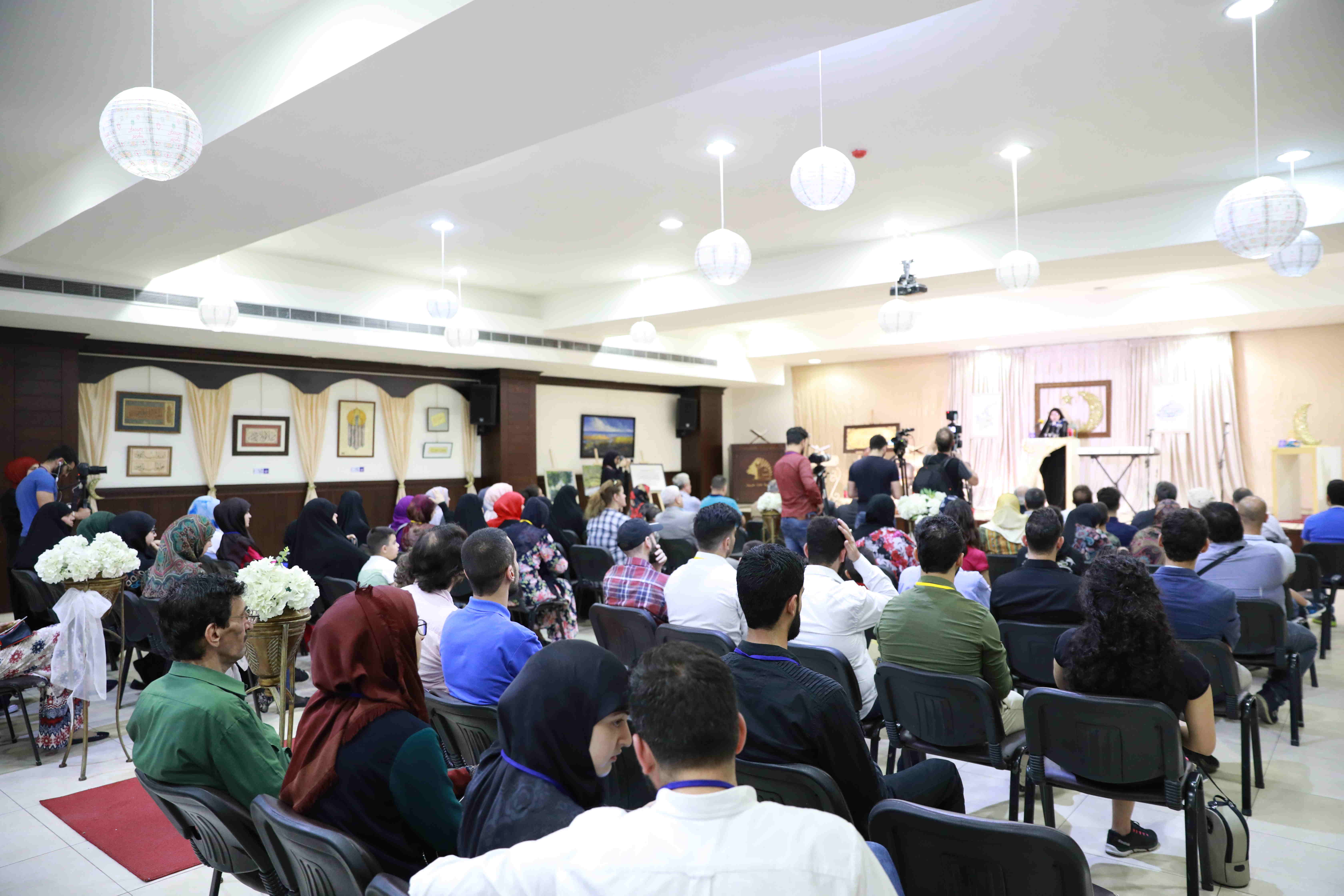 هذه اللوحات المنتشرة في الشق الأيمن من المعرض تتكامل مع لوحات أخرى عن شماله تحوي مخطوطات عربية، حيت تزخر اللوحات بالايات القرانية والزخارف بالخط العربي التي لك أن تتيه في جمال خطوطها المنسابة والمتناسقة. وفي منتصف المعرض هلال ونجمة يتوسطان منصة التكريم في حين تنتشر الموسيقى الرمضانية في الارجاء، وتتلالا الفوانيس في المعرض في جو روحي ورونق رمضاني جميل.