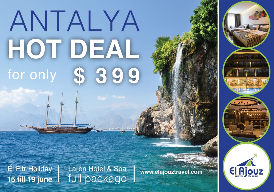 في هذا الإطار، وبمناسبة عيد الفطر السعيد، تنظم وكالة العجوز للسياحة والسفر رحلة بطائرة خاصة إلى أنطاليا من 15 إلى 19 حزيران الجاري ضمن عرض مغري (بـ 399$ فقط)