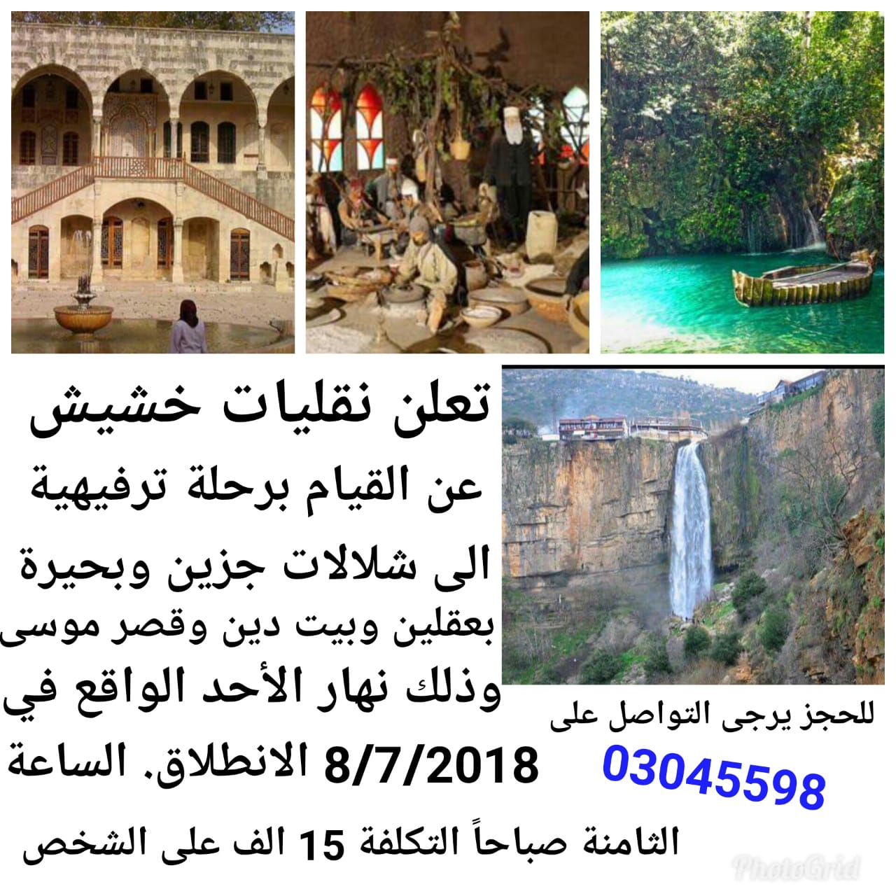 أعلنت نقليات خشيش عن تنطيم رحلة ترفيهية الى شلالات جزين وبحيرة بعقلين وبيت الدين وقصر موسى وذلك نهار الأحد الواقع في الثامن من تمّوز القادم 2018.