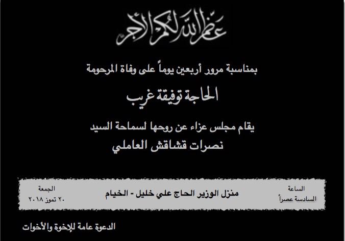 بمناسبة مرور أربعين يوماً على وفاة المرحومة الحاجة توفيقة غريب