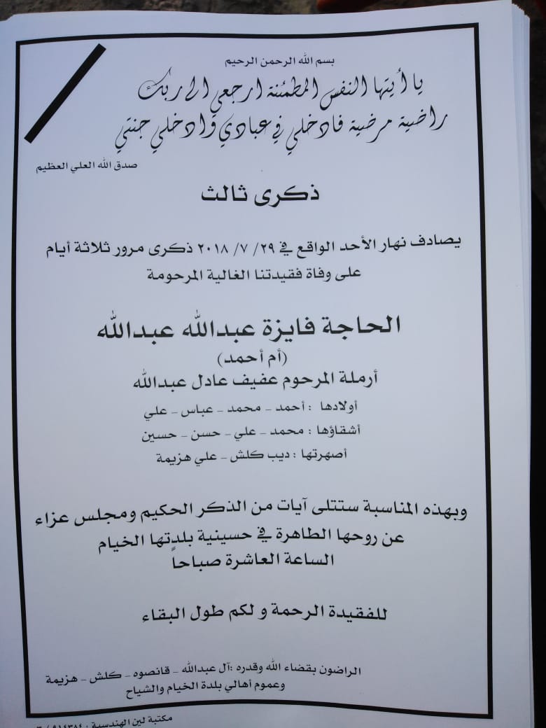 يقام مجلس عزاء عن روحها الطاهرة في حسينية بلدتنا الخيام وتتلى آي من الذكر الحكيم عند العاشرة من صباح يوم الأحد الموافق 29 تموز 2018.