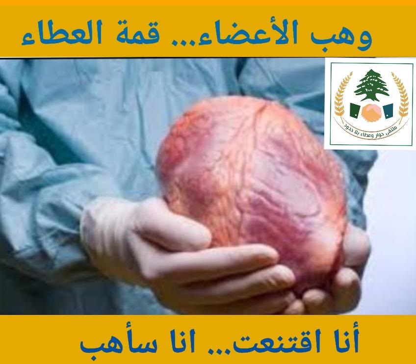 انطلاقا من التعاليم السماوية السمحاء وإيمانا منا بضرورة تعميم ونشر ثقافة وهب الأعضاء وإستكمالا لحملة التوعية التي تهدف إلى نشر المعرفة حول هذه الثقافة التي تعتبر ارقى واسمى انواع التضحية والعطاء والتكافل والتعاضد بين بني البشر وقمة التطور الفكري والحضاري والإنساني في ما بينهم يتشرف ملتقى حوار وعطاء بلا حدود وهيئته الإستشارية وجميع اعضائه ، بدعوتكم للمشاركة في دعم الحملة الانسانية التوعوية للتضامن مع المرضى المعذبين الذين يعانون من أصعب مراحل الوهن والتعب الجسدي والإحباط النفسي وإنسداد الأفق ، ومن أجل المساهمة في إنقاذ حياة الآلاف من اهلنا المرضى الذين يحتاجون كل يوم لمن يمنحهم الأمل من جديد بواسطة وهب الأعضاء لأنهم يعانون من مراحل متقدمة من أمراض قصور القلب والكلى والكبد ، او تلف أوفقدان لقرنية العين او من اي مرض آخر في غيرها من الأعضاء التي يمكن وهبها وزراعتها .