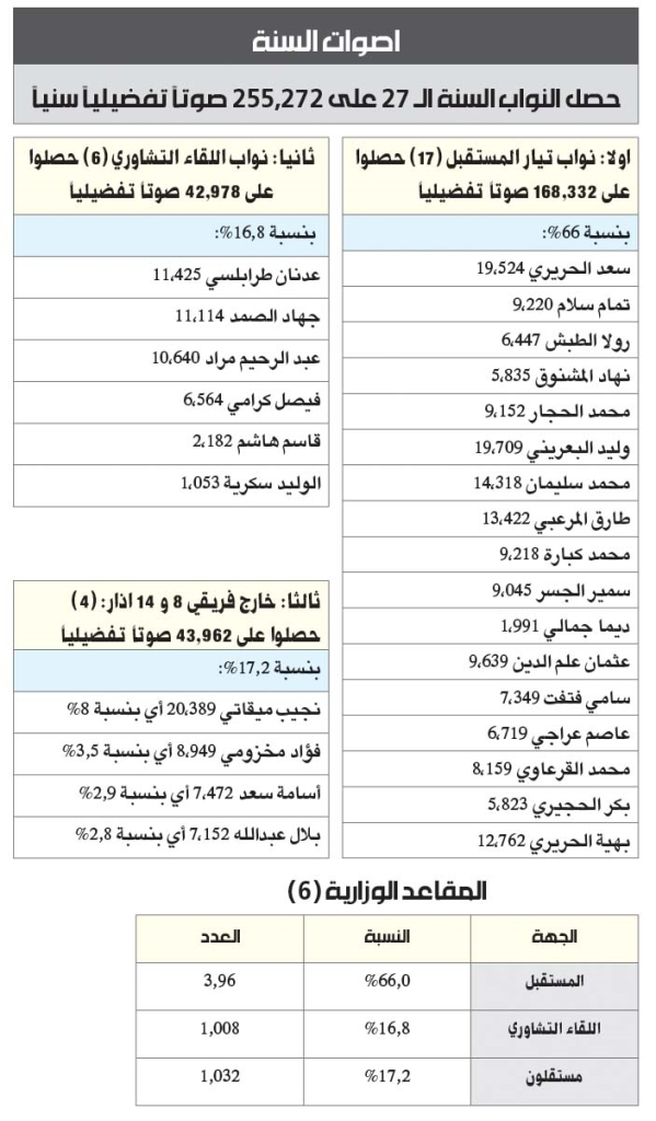 وإذا أخذنا بقاعدة «المستقبل» هذه، فإن النواب السنّة الـ17، المنضوين في كتلة الرئيس سعد الحريري، قد حازوا 168332 صوتاً تفضيلياً، وبالتالي فإن نسبتها من إجمالي الاصوات التفضيلية السنيّة هي 34.9 في المئة. وبالتالي، سيكون هناك 270 ألف صوت تفضيليّ سنّي غير ممثلين، لا في المجلس النيابي ولا في الحكومة.