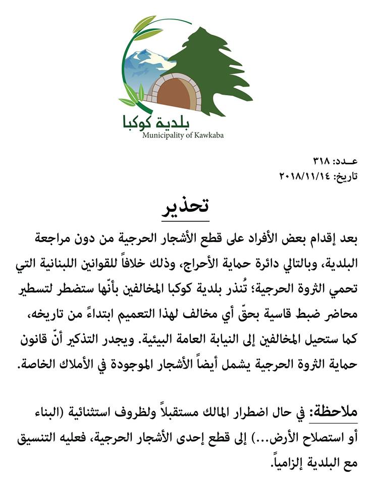 تنذر بلدية كوكبا المخالفين بأنها ستضطر لتسطير محاضر ضبط قاسية بحق أي مخالف لهذا التعميم ابتداء من تاريخه، كما ستحيل المخالفين الى النيابة العامة البيئية.