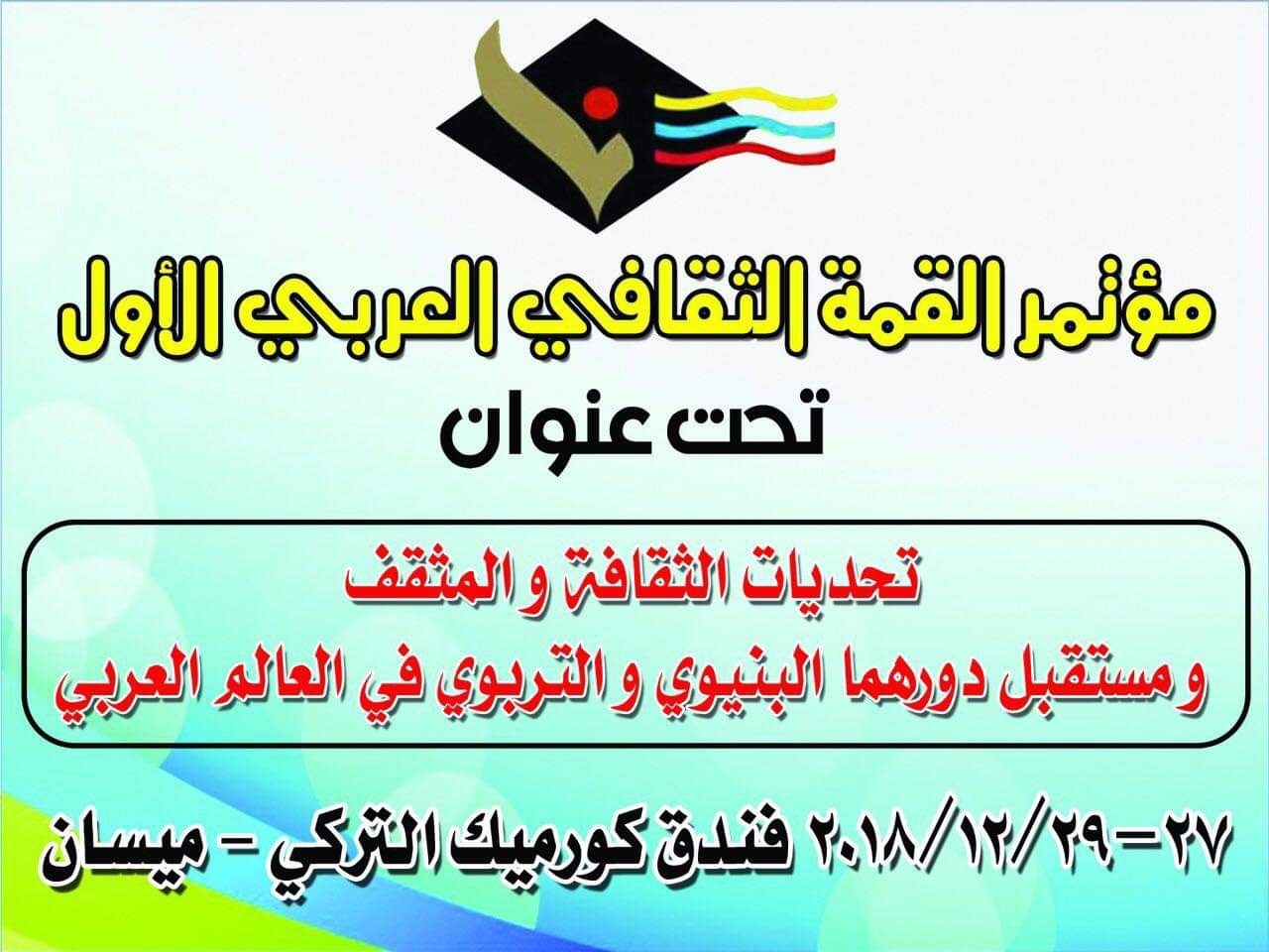 تحت عنوان (تحديات الثقافة والمثقف ومستقبل دورهما البنيوي والتربوي في العالم العربي ) تنطلق فعاليات (مؤتمر القمة الثقافي العربي الأول ) يوم الخميس 27 /12/2018 في قاعة فندق كورميك التركي - محافظة ميسان جمهورية العراق ولمدة (3) أيام وسيحضر في هذا المؤتمر التنويري قيادات في الأدب والفن والتسامح والسلام والتنمية البشرية وحقوق الطفل وتمكين المرأة وحقوق الإنسان والعمل التطوعي والاقتصاد واغلب التخصصات التي تسهم في بناء الإنسان وقال الأديب محمد رشيد : هنالك حوارات جادة ولقاءات مثمرة كانت مع شخصيات مهمة في الوطن العربي منها ( الموسيقار نصير شمه / الروائية سعيدة بنت خاطر من سلطنة عمان / الفنانة هند كامل / النائبة د. ماجدة التميمي / الفنانة د. هديل كامل / النائب بهاء الدين النوري/د. سناء الشعلان من الأردن / الأستاذ علاء شلبي رئيس مجلس أمناء المنظمة العربية لحقوق الإنسان في القاهرة / د. إياد البرغوثي رئيس الشبكة العربية للتسامح من فلسطين /البروفيسور د. شيرزاد النجار / المخرج خالد يوسف / الفنان لطفي بوشناق/ المفكر د. عبد الحسين شعبان / الدكتور مظهر محمد صالح / د. حسن بيلاوي رئيس المجلس العربي للطفولة والتنمية في القاهرة / الأستاذ حسن بو هزاع رئيس جمعية الكلمة الطيبة من البحرين /الأستاذ عبد الرزاق المريسي أمين عام الاتحاد العربي للتطوع من اليمن/ الأستاذة زهراء باقر المدير الإقليمي في الشرق الأوسط لمبادرة ياسمين / النائب د. يوسف الغربي من المغرب / الاستاذة تميمة النيسر / الأستاذ ضرار الفلاسي مدير عام مؤسسة وطني من الإمارات والسيدة رجاء كموني والأستاذ فادي أبي علام رئيس حركة السلام من لبنان والكاتب جاسم المطير والبروفيسور د. تيسير الالوسي من هولندا و البروفيسور قاسم حسين صالح رئيس تجمع عقول ) وغيرهم كثيرون يخططون من اجل يكون هذا المؤتمر نوعي في تشخيص المعوقات وتقديم الحلول للمثقف العربي . هذا ويذكر أن مؤتمر القمة الثقافي أقيم في محافظة ميسان ثلاث دورات للسنوات (2011/2016/2018) وكان مؤتمرا عراقيا وبعض توصيات المؤتمرين الثاني والثالث أكدت على إقامة ( مؤتمر قمة ثقافي عربي ) يهدف لإيجاد حلول للمثقف العربي إزاء التحديات التي واجهته منها (الحروب والحصار والتعصب والقتل على الهوية والأمية و....و....) من اجل أن يعيش في بيئة تحلم بالسلام ...تؤمن بالتسامح .....تنعم بالمحبة ...تهدف للتنمية .