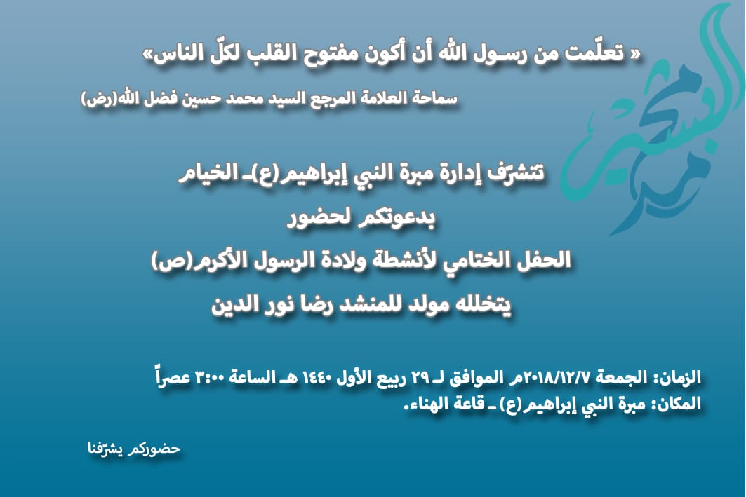 في أجواء ذكرى مولد الرسول الأكرم محمد (ص)، تقيم إدارة مبرة النبي ابراهيم (ع) - الخيام حفلاً ختامياً لأنشطة المناسبة، يتخلله مولد للمنشد رضا نورالدين.