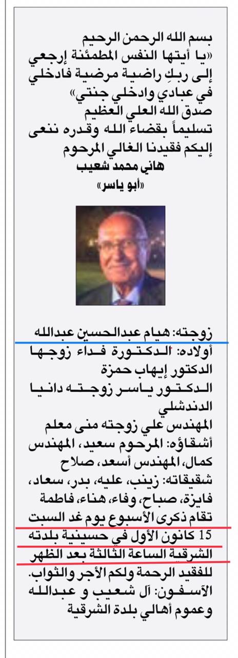 سجل التعازي بالمأسوف عليه المرحوم هاني محمد شعيب (أبو ياسر)