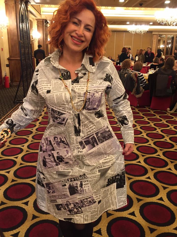 وخلال مشاركتها في الغداء السنوي ل Women’s Leagueالذي نظمته ال AUBفي الكورال بيتش ارتدت فستانا من تصميمها يختصر جزءا من مسيرة طويلة من الابداع، ووصفته بالقول: صممت عملاً فنياً من أخبار الصحف يوثق مسيرة الأعمال الفنية في الصحف"، وقد شكل هذا الفستان الأنيق فكرة مختلفة وجديدة، كما يعد توثيقاً لزمن تواجه