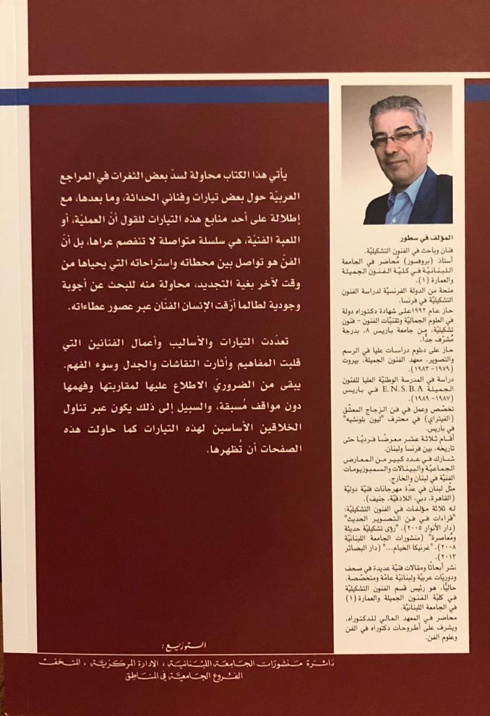 يتناول الكتاب الجديدالتيارات الفنية الحديثة والمعاصرة، من ضمنها تجارب الفنانين العالميين، وبحث مطوّل عن فن الزجاج المعشق (الفيتراي) في أوروبا ولبنان، وصولاً إلى "النت آرت" (فن الأنترنت).