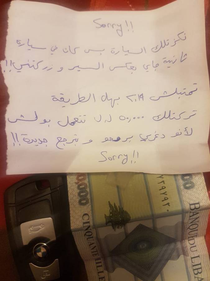 انتشرت صورة في مواقع التواصل الاجتماعي لسيارة تعرضت لحادث صغير مرفقة برسالة كتب عليها: "sorry نكزتلك السيارة بس في سيارة جايي بعكس السير وزركتني!! حتى متبلش 2019 بهل الطريقة تركتلك 50 ألف ليرة تتعمل بوليش لانو دغري بروحو وبترجع جديدة!! Sorry!!” ونشرتها باتريسيا مرفقة بهذه الكلمات: "أحيّي الشخص المهذب والمتحضِر واللطيف الذي ترك لي هذه الورقة مع 50 ألف ليرة لبنانية على سيارتي. لم تكن هناك حاجة للدفع لأن تأميني يغطي جميع المخاطر، لكنني أقدّر جداً هذه اللفتة."