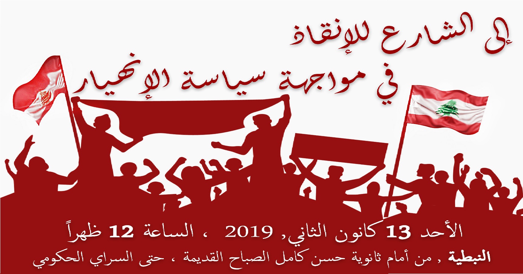 تحت عنوان «إلى الشارع للانقاذ في مواجهة سياسة الانهيار»، تتواصل الدعوات عبر مواقع التواصل الاجتماعي «فيسبوك» و«تويتر» و«الفايسبوك» و«الواتس اب» لناشطين من مختلف الانتماءات، للتظاهر ظهر يوم غدٍ الأحد في النبطية، احتجاجاً على التدهور المعيشي والوضع الاقتصادي الصعب الذي تمر به البلاد.