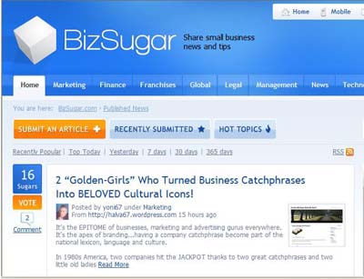 Bizsugar هو موقع اجتماعي يستقبل مختلف المستخدمين ومختلف المجالات مثل اصحاب الاعمال الصغيرة وأصحاب المشاريع الخاصة والمديرين والمواقع , يستخدم موقع Bizsugar لنشر التدوينات والفيديوهات والمنتجات أو أى محتوى جديد , موقع Bizsugar بسيط وسهل فى الاستخدام وفوائده كبيرة فهو يسمح للمستخدمين أن يشرعه بالتصويت على أفضل المشاركات وتقيمها وهذا يسمح لموقعك ان يحصل على المزيد من النشاط والزوار.تم إنشاء الموقع في عام 2007 من قبل شركة DBH Communications Inc .